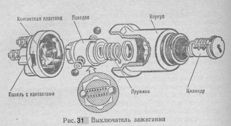 В автомобиле ЗиЛ-130 ключ имеет три положения: первое (головка ключа расположена вертикально) — зажигание выключено; второе (поворот ключа по часовой стрелке) — зажигание включено, третье (поворот ключа до отказа) — включены зажигание и стартер. Во всех случаях вместе с зажиганием включаются контрольно-измерительные приборы.