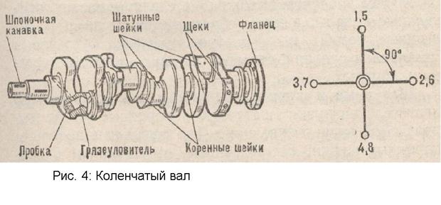 На стержне шатуна выштампован номер детали, а на крышке метка. Номер на шатуне и метка на его крышке всегда должны быть обращены в одну сторону. К верхней и нижней головкам шатуна подводится масло: к нижней головке — через канал в коленчатом валу, а к верхней — через прорезь. Из нижней головки шатуна масло через отверстие выбрызгивается на стенки цилиндров. В двигателях на одной шатунной шейке коленчатого вала закреплено по два шатуна. Для правильной их сборки с поршнями нужно помнить, что шатуны правого ряда цилиндров собраны с поршнями так, что номер на шатуне обращен назад по ходу автомобиля (см. рис. 3), а левого ряда — вперед, т. е. совпадает с надписью на поршне. Коленчатый вал воспринимает усилия, передаваемые от поршней шатунами, и преобразует их в крутящий момент, который затем через маховик передается агрегатам трансмиссии. В двигателе ЗиЛ-130 коленчатый вал стальной. Коленчатый вал (рис. 4) состоит из шатунных и коренных шлифованных шеек, щек и противовесов. На переднем конце вала двигателей ЗМЗ-53-12 и ЗИЛ-130 имеется углубление для шпонки распределительной шестерни и шкива привода вентилятора, а также нарезное отверстие для крепления храповика; задняя часть вала выполнена в виде фланца, к которому болтами прикреплен маховик. В углублении задней торцовой части коленчатого вала расположен подшипник ведущего вала коробки передач. Количество и расположение шатунных шеек коленчатого вала зависит от числа цилиндров. В V-образном двигателе количество шатунных шеек в два раза меньше числа цилиндров, так как на одну шатунную шейку вала установлено по два шатуна — один левого и другой правого рядов цилиндров. Шатунные шейки коленчатого вала многоцилиндровых двигателей выполнены в разных плоскостях, что необходимо для равномерного чередования рабочих тактов в разных цилиндрах. В восьмицилиндровых V-образных двигателях коленчатые валы имеют по четыре шатунные шейки, расположенные под углом в 90°.