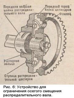 Распределительный вал (см. рис. 5) служит для открытия клапанов в определенной последовательности в соответствии с порядком работы двигателя. Распределительные вал отливают из специального чугуна или отковывают из стали. Устанавливают его в отверстия стенок и ребрах картера. Для этой цели на валу имеются цилиндрические шлифованные опорные шейки. Для уменьшения трения между шейками вала и опорами в отверстия запрессовывают втулки, внутренняя поверхность которых покрыта антифрикционным слоем. На валу, помимо опорных шеек, имеются кулачки — по два на каждый цилиндр, шестерня для привода масляного насоса и прерывателя-распределителя и эксцентрик для привода топливного насоса. От переднего торца распределительных валов двигателя ЗИЛ-130 приводится в действие датчик пневмоцентробежного ограничителя частоты вращения коленчатого вала двигателя. Трущиеся поверхности распределительного вала для уменьшения износа подвергнуты закалке с помощью нагрева током высокой частоты.