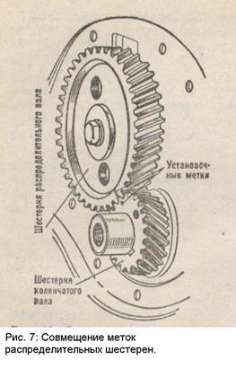 Для предупреждения осевого смещения вала при работе двигателя между шестерней и передней опорной шейкой вала установлен фланец, который закреплен двумя болтами к передней стенке блока цилиндров (рис. 6). Внутри фланца на носке вала установлено распорное кольцо, толщина которого несколько больше толщины фланца, в результате чего достигается небольшое осевое смещение распределительного вала. В четырехтактных двигателях рабочий процесс происходит за четыре хода поршня или два оборота коленчатого вала, т. е. за это время должны последовательно открыться впускные и выпускные клапаны каждого цилиндра, а это возможно если число оборотов распределительного вала будет в 2 раза меньше числа оборотов коленчатого вала, поэтому диаметр шестерни, установленной на распределительном валу, делают в 2 раза большим, чем диаметр шестерни коленчатого вала. Клапаны в цилиндрах двигателя должны открываться и закрываться в зависимости от направления движения и положения поршней в цилиндре. При такте впуска, когда поршень двигается от в. м. т. к н. м. т., впускной клапан должен быть открыт, а при такте сжатия, расширения (рабочего хода) и выпуска закрыт. Чтобы обеспечить такую зависимость, на шестернях газораспределительного механизма делают метки: на зубе шестерни коленчатого вала и между двумя зубьями шестерни распределительного вала (рис. 7). При сборке двигателя эти метки должны совпадать. Толкатели предназначены для передачи усилия от кулачков распределительного вала к штангам.
