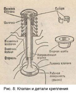 Коромысла передают усилие от штанги к клапану. Изготовляют их из стали в виде двуплечего рычага, посаженного на ось. В отверстие коромысла для уменьшения трения запрессовывают бронзовую втулку. Полая ось закреплена в стойках на головке цилиндров. От продольного перемещения коромысло удерживается сферической пружиной. На двигателях ЗИЛ-130 коромысла не равноплечие. В короткое плечо завернут регулировочный винт с контргайкой, упирающийся в сферическую поверхность наконечника штанги. Клапаны служат для периодического открытия и закрытия отверстий впускных и выпускных каналов в зависимости от положения поршней в цилиндре и от порядка работы двигателя. В двигателе ЗиЛ-130 впускные и выпускные каналы выполнены в головках цилиндров и заканчиваются вставными гнездами из жаропрочного чугуна. Клапан (рис. 8) состоит из головки и стержня. Головка имеет узкую, скошенную под углом 45 или 30° кромку (рабочая поверхность), называемую фаской. Фаска клапана должна плотно прилегать к фаске седла, для чего эти поверхности взаимно притирают. Головки впускных и выпускных клапанов имеют неодинаковый диаметр. Для лучшего наполнения цилиндров свежей горючей смесью диаметр головки впускного клапана делают большим, чем диаметр выпускного. -Система охлаждения:
