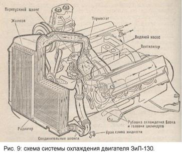 Отдельные детали системы охлаждения соединены трубками и прорезиненными шлангами. Степень охлаждения регулируется при помощи термостата, жалюзи. Жидкость в систему охлаждения заливают через горловину радиатора или расширительного бачка. Вместимость системы охлаждения двигателя автомобиля ЗиЛ-130 —26л. Охлаждающую жидкость выпускают через краники или отверстия, закрываемые резьбовыми коническими пробками, расположенными в нижнем патрубке блока цилиндров и пусковом подогревателе.
