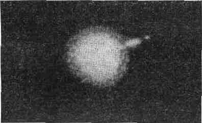 Рис. 58. Взрыв в ядре галактики М 82. образования космических тел не путем сгущения (или не только путем сгущения) разреженной среды, а путем распада первичных сверхтвердых тел. Как мы уже видели, эти дозвездные, или, лучше сказать, незвездные (ведь звезды могут из них и не образоваться) тела являются могучими аккумуляторами энергии. Поэтому вполне можно предположить, что квазары представляют собой не что иное, как одну из форм проявления незвездной материи, хотя справедливость требует отметить, что и подобная точка зрения сталкивается с целым рядом трудностей. В 1963 г. американский астрофизик А. Сандейдж завершил работу по изучению движения газа в сравнительно близкой к нам галактике М82. Сандейдж пришел к выводу, что характер этого движения указывает на то, что приблизительно 1,5 млрд. лет назад из ядра М 82 произошел выброс газовых масс, более чем в миллион раз превосходящих массу Солнца. Эти и другие подобные им факты и привели академика Ам-барцумяна к мысли, что в состав галактических ядер входят сверхплотные тела из незвезднои материи. До последнего времени о наличии в природе подобных материальных образований можно было судить только чисто теоретически, поскольку в устойчивом состоянии незвездная материя практически не излучает и, следовательно, не может быть обнаружена при обычных наблюдениях. Но вполне вероятно, что с открытием сверхзвезд мы впервые получили возможность наблюдать незвездную материю в таком состоянии, когда она бурно излучает (т. е. в момент взрыва). Подобное предположение подтверждается еще и тем обстоятельством. что обнаружены галактические ядра, которые находятся в «промежуточном» состоянии—«возбужденные» ядра. Светимость их выше, чем у спокойных ядер, по значительно ниже, чем у сверхзвезд. Спектральные наблюдения показали, что возбужденные ядра выбрасывают потоки газового вещества со скоростями, достигающими десяти тысяч километров в секунду. Можно предполагать, что активность галактических ядер, а также мощные взрывы — все это проявления находящихся & них незвездных тел. Что касается направления эволюции ядер, то окончательный ответ на этот вопрос могут дать лишь дальнейшие исследования. Но, согласно предположениям академика Амбарцумяна, не исключена возможность, что исходным пунктом развития являются изолированные незвездные тела, которые переходят в активное состояние, испускают огромное количество энергии и в конце концов переходят в спокойное состояние. Были сделаны попытки связать эту точку зрения с гипотезой «расширяющейся Вселенной». Не являются ли незвездные тела сгустками первоначального сверхпланетного вещества, которые по тем или иным причинам отстали от общего процесса эволюции и в течение некоторого времени находились в устойчивом состоянии? Подобное предположение вполне допустимо, хотя в то же время вряд ли возможно уложить все многообразие явлений, происходящих в мире галактик, в упрощенную схему расширяющейся Вселенной. В частности, не исключена возможность, что незвездная материя образуется в наше время из каких-то других ее форм. Интересно упомянуть и о соображениях советского ученого В. Л. Гинзбурга, который считает, что важную роль в выделении мощной энергии квазаров могут играть сверхплотные магнитные поля. Подсчеты показывают, что при определенных условиях эн