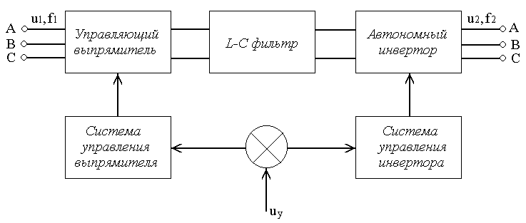 Основными элементами силовой электроники, ставшими базой для создания статических преобразователей, явились полупроводниковые приборы. Проводимость большинства из них в существенной мере зависит от приложенного напряжения: в прямом направлении их проводимость велика, в обратном – мала (то есть полупроводниковый прибор имеет два явно выраженных состояния: открытое и закрытое). Полупроводниковые приборы бывают неуправляемыми и управляемыми. В последних можно управлять моментом наступления их высокой проводимости (включением) посредством управляющих импульсов малой мощности. Инвертирование – это преобразование энергии постоянного тока в энергию переменного тока при заданном выходном напряжении или токе и частоте. Если в инверторе используются тиристоры, то необходимо применение схем принудительной коммутации. Инверторы, работающие от источника постоянного напряжения и определяющие величину напряжения на нагрузке, в то время как ток нагрузки определяется сопротивлением нагрузки, называются инверторами напряжения. Инверторы, работающие от источника постоянного тока, называются инверторами тока. Источник постоянного тока реализуется путём включения катушки индуктивности последовательно с источником постоянного напряжения. Преобразователи этого типа являются источниками тока по отношению к нагрузке. В зависимости от характера нагрузки такие преобразователи могут стабилизировать выходное напряжение или мощность, могут изменять по определённому закону частоту выходного сигнала для регулирования количества оборотов двигателя переменного тока. Выходной сигнал инвертора обычно содержит много гармонических составляющих. Их набор может изменяться путём применения специальных фильтров или широтно-импульсной модуляции. Преобразователи частоты.Различают следующие преобразователи частоты: с промежуточным звеном постоянного тока, непосредственной связью питающей сети и цепи нагрузки (циклоконверторы), промежуточным звеном переменного тока (циклоинверторы). Преобразователь частоты с промежуточным звеном постоянного тока. Переменное напряжение питающей сети (рис. 1) выпрямляется с помощью управляющего выпрямителя, фильтруется L-C фильтром и подается на автономный инвертор. Функции регулирования частоты выходного напряжения осуществляет инвертор, а напряжения – выпрямитель. Иногда обе функции осуществляет инвертор, а выпрямитель выполняется неуправляемым.