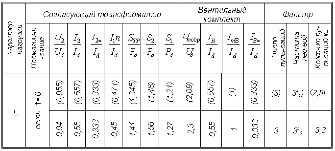 Для выбора основных элементов силовой схемы (трансформатора, тиристоров) управляемого выпрямителя воспользуемся расчетными соотношениями (таб. 1). Таблица 1.