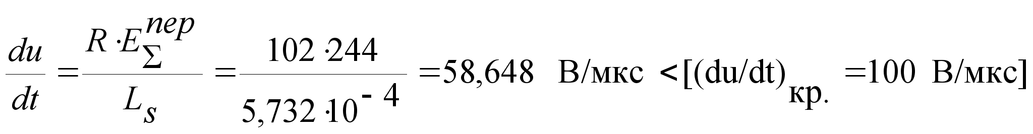Суммарная величина среднего тока через вентиль и добавки при разряде конденсатора не должна превышать допустимого значения Iп.к. = 80 А при заданных условиях охлаждения. Проверим это IΣ = 33,3 + 1,9 = 35,150 A. п.к.] A. б) Защита от перенапряжений, возникающих при коммутациях в цепи нагрузки. Рассмотрим наихудший (с точки зрения нагрузки на полупроводниковый прибор) случай перенапряжения, когда происходит отключение индуктивной нагрузки от работающего преобразователя, и величина э.д.с. самоиндукции складывается с фазным напряжением, действующим на вентиль. Для того, чтобы использовать уже рассчитанную выше RCA – цепочку для данного вида перенапряжении, выполним проверочный расчет величины (du/DT) при воздействии суммарной э.д.с., равной ЕперΣ