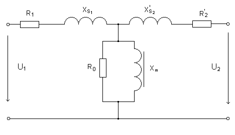 Примечание: величины в скобках для идеального выпрямителя без потерь. Выбор силового трансформатора.По таблице 1 определяем расчетную габаритную мощность трансформатора. Sтр. =1,41 Рd =1,41*10кВА=14,6 кВА. Из справочной литературы выбираем специализированный трансформатор ТСП – 160/0,7 – УХЛ4 (соответствует ТУ 16 – 717.052-79. Изготовитель УЭТМ г. Свердловск). Габаритные размеры: длина – L = 625 мм, ширина – В = 305мм, высота – Н = 385 мм. Полная масса 120 кг. Величины потерь в данном трансформаторе: Рх.х. =140 Вт, Рк.з. = 550 Вт при Uк.з. = 5,2 %, I х.х. = 10 %. Расчет паразитных параметров трансформатора. Выбранный трансформатор имеет габаритную мощность Sтр. = 14,6 кВА. Найдем габаритную мощность на одну фазу: Pгаб=Sтр /m=14,6*103/3=4866,667 ВА. Схема соединений обмоток «звезда – звезда», следовательно, U1л=380В и U1ф.=220В (в соответствии с заданием). Определим ориентировочную величину коэффициента трансформации c учетом колебаний уровня напряжения в промышленных сетях: ктр.=U1ф./ U2=U1ф. / (0,94 Ud)=(220– 220*0,15)/(0.94*100)=1,989 Номинальный ток в первичной обмотке трансформатора: I1ном=Pгаб/U1фА=4866,667/220=22,121 А Из условий опыта холостого хода определяем: I1х.х. =0,1*I1ном. = 0,1*22,121 = 2,212 А. Полная кажущаяся мощность холостого хода равна Sх.х. = U1н.*I1х.х. = 220*2,212 = 486,667 ВА. Угол сдвига тока относительно напряжения хх=arccos(Pхх/3*Sхх)=arccos(140/3* 486,667)=84,497о. Расчетное активное сопротивление, учитывающее потери на гистерезис и вихревые токи Rор=Рхх/3*I2хх=140/3*2,2122=9,538 Ом. Индуктивное сопротивление намагничивания Хор=*Lор= Rор*tgхх=9,538*tg84,497=99 Ом. Расчетная величина индуктивности намагничивания Lор= Хор/99/2**50=0,315 Гн. По данным опыта короткого замыкания аналогично находим: Uк.з. = 0,052U1н. = 0,052*220 = 11,44 В; Полная кажущаяся мощность короткого замыкания равна Sк.з. = Uк.з.* I1н. = 11,44*22,121=253,066 ВА; Угол сдвига тока относительно напряжения кз=arccos(Pкз/3*Sкз)=arccos(550/3* 253,066)=43,557о. Расчетное активное сопротивление, учитывающее потери в обмотках трансформатора (приведение к вентильной стороне): RрТР=( R2р+ R’1р) = Pкз/3*I2кз*К2тр=550/3*22,1212*1,9892=0,095 Ом. Расчетная величина индуктивного сопротивления, обусловленного магнитными потоками рассеяния (ХS2р+Х’S1р)=(R2р+ R’1р)tgкз=0,095tg43,557=0,090 Ом. Индуктивность рассеяния: (LS2р+L’S1р)=(ХS2р+Х’S1р)/=0,09/314=2,866*10-4 Гн. Итак: Ro= 9,538 Ом. Xo= 99 Ом. Lo= 0,315 Гн. Ls=2,866*10-4 Гн. Xs=0,09 Ом. Rтр=0,095 Ом. Схема замещения одной фазы силового трансформатора и ее параметры:Выберем Т-образную схему замещения (рис. 3).