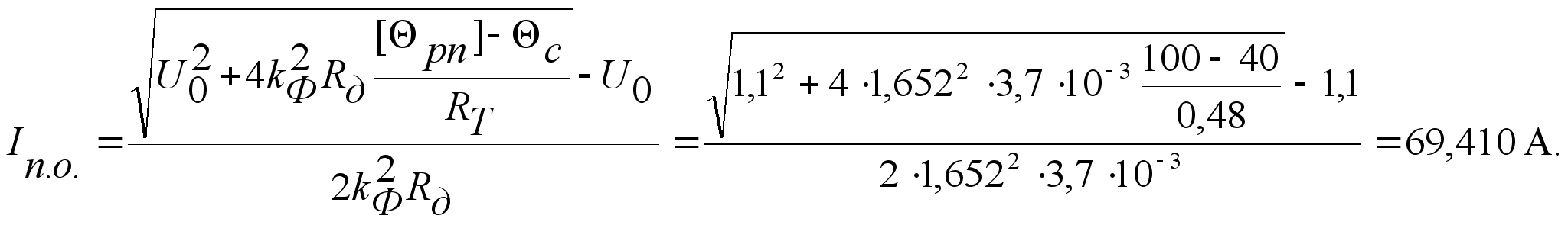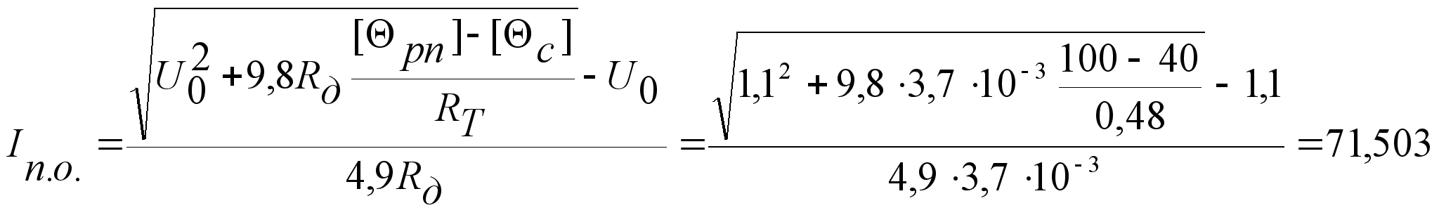 [Θpn] – максимально допустимая температура полупроводниковой структуры , [Θс] – заданная температура окружающей среды . В соответствии с заданием преобразователь работает в климатических условиях У3 по ГОСТ 15543-70. (Климат умеренный. Преобразователь работает в закрытых помещениях с естественной вентиляцией без искусственно регулируемых климатических условий, где колебания температуры и влажности воздуха, и воздействия песка и пыли существенно ниже, чем на открытом воздухе. Токр.ср. = -40 оС – +40 оС, DT=40oC/8часов.) RT – общее установившееся тепловое сопротивление (при условии охлаждения). С выбранным охладителем типа О241-80 для данного тиристора Rт=Rп-к+Rкпо-ос=0,24+0,24=0,48 ОС/Вт. Где Rкпо-ос – переходное тепловое сопротивление контактная поверхность охладителя – охлаждающая среда. U0 – пороговое напряжение предельной ВАХ прибора. Используя параметры данного тиристора и температурные условия эксплуатации (tmax = 40 ˚C) , определим предельный ток прибора.