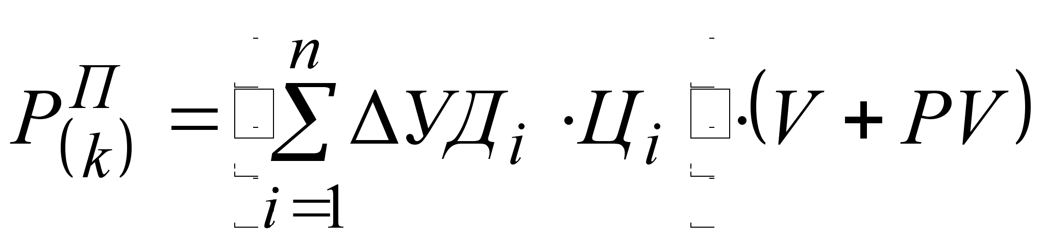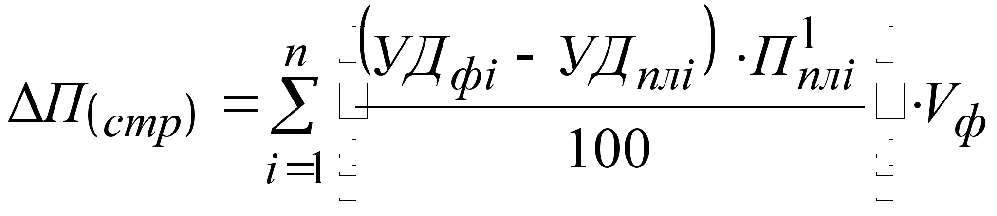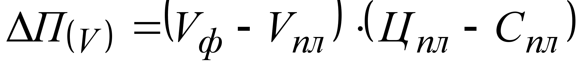 где УДф i, УДпл i - соответственно фактический и плановый удельный вес i-го вида продукции в общем объеме реализации, %; П1пл i - плановая сумма прибыли на единицу i-го вида продукции; Vф - фактический общий объем реализованной продукции в условно-натуральном выражении. Также для расчета влияния структурного фактора на изменение общей суммы прибыли можно использовать модель: