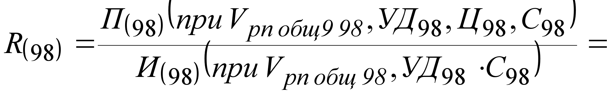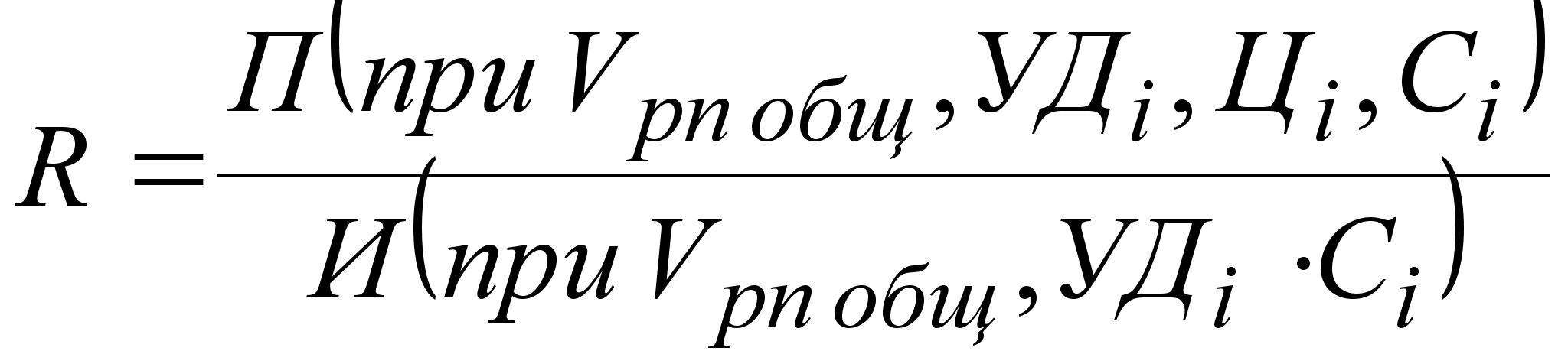 где Vрп общ - общий объем реализованной продукции; УДi - удельный вес i-го вида продукции в общем объеме; Цi - цена реализации i-го вида продукции; С i - себестоимость i-го вида продукции. Расчет влияние факторов первого порядка на изменение уровня рентабельности в целом по предприятию выполним способом цепных подстановок, используя данные таблицы 3.: