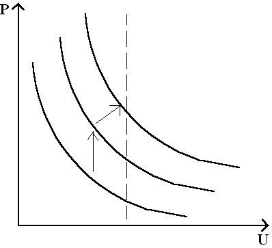 Ин Рис. 3 фляция оказывает сильное воздействие на занятость. Эмпирические исследования показали, что между уровнем занятости и инфляцией существуете определенная взаимосвязь. Инфляция держится на низком уровне при высокой безработице, и наоборот. В 1958 году английский экономист А. Филлипс предложил графическую модель инфляции спроса, выражающую связь между уровнем безработицы и темпами роста средней заработной платы. Используя в своей работе данные английской статистики за 1850-1860 гг. он построил кривую, наглядно показывающую обратную зависимость между изменением ставок заработной платы и уровнем безработицы. Позднее из этой зависимости американскими экономистами П. Самуэльсоном и Р. Солоу был сделан вывод, что кривая Филлипса описывает выбор между инфляцией и безработицей, когда уменьшить одну можно лишь увеличив другую10. Причиной такой зависимости заключается в том, что при высокой безработице заработная плата держится на низком уровне, что вызывает замедление роста цен. По кривой А. Филлипс установил, что увеличение безработицы в Англии сверх 2.5-3% приводило к резкому замедлению роста цен и заработной платы. Таким образом, правительство может использовать увеличение инфляции для борьбы с безработицей. Позднее этот вывод теоретически аргументировал экономист Р. Липси.Также Р. Солоу и П. Самуэльсоном была создана модификация кривой Филлипса для разработок экономической политики. Они заменили в этой кривой ставки заработной платы на темп роста товарных цен, или инфляцию. При помощи этой кривой стало возможным рассчитывать равновесие между достаточно высокими уровнями занятости и производства и определенной стабильностью цен. Если правительство рассматривает уровень безработицы U1 (ему соответствует темп роста цен Р1) в стране излишне высокий, то для его понижения проводятся бюджетные и денежно кредитные мероприятия, стимулирующие спрос (см. рис.3). Так, увеличивая поток инвестиций, государство может побудить предприятия к расширению производства и сбыта, а значит, увеличению рабочих мест. Норма безработицы снижается до уровня U2, но одновременно темпы инфляции возрастают до Р2. Такие манипуляции могут вызвать "перегрев" экономики и как следствие кризисные явления. Такая ситуация вынуждает правительство ввести кредитные ограничения, сократить расходы из государственного бюджета и т.д. В результате этих возвратных действий правительства уровень цен снизится до уровня РЗ, а безработица возрастет и ее норма составит U3. Неоднократная практика экономического регулирования показала, что этот метод может быть применен только на короткие периоды, поскольку в долгосрочном плане (5-10 лет) несмотря на высокий уровень безработицы, инфляция продолжает нарастать, что объясняется целым рядом обстоятельств. Среди этих обстоятельств необходимо выделить политику стимулирования совокупного спроса. Стремление правительства ценой инфляции "купить" более низкий уровень безработицы успешны только тогда, когда у хозяйствующих агентов удается создать так называемые "ложные ожидания": а попросту - обмануть. Пока потенциальные работники не поймут, что условия, на которые они согласились, на самом деле не лучше тех, которые они раньше отвергали, занятость будет расти. Но она тут же упадет до первоначального уровня, как только занятые