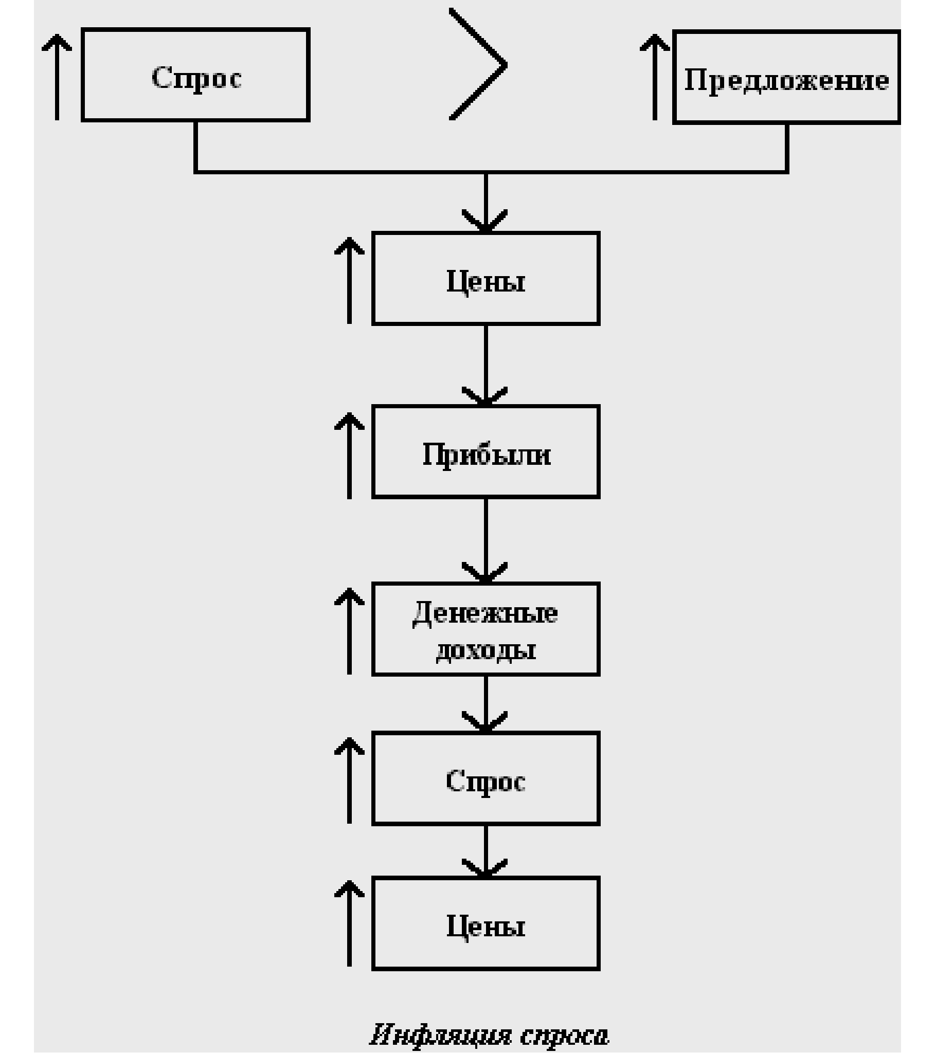 В качестве косвенного показателя уровня инфляции используются данные об отношении товарных запасов к сумме денежных вкладов населения (сокращение запасов и рост вкладов свидетельствуют о повышении степени инфляционного напряжения.) Данные о превышении доходов населения над расходами в процентах к доходам также могут характеризовать уровень инфляции. Если доходы растут быстрее или даже одинаково с ценами, это свидетельствует об опасности раскручивания инфляционной спирали. Основные причины инфляционного роста ценОбъяснения причин дисбаланса различны. Одни экономисты (Дж. М. Кейнс и его последователи) объясняли его чрезмерным спросом при полной занятости, т. е. со стороны спроса. Другие – неоклассики – искали причину в росте производственных расходов или издержек производства, т. е. со стороны предложения. Думается, что данные оценки односторонни и истину следует искать в синтезе двух противоположностей, т. е. объяснять инфляцию, как со стороны спроса, так и со стороны предложения. Рост цен может быть связан с превышением спроса над предложением товаров, однако такая диспропорция между спросом и предложением во многих случаях не является инфляцией. Пример - энергетический кризис 70х в США, когда нефтедобывающие страны подняли цены на нефть в десятки раз, а на другие товары и услуги в то время цены возросли на 7-9%. Независимо от состояния денежной сферы товарные цены могут изменяться вследствие роста производительности труда, циклических и сезонных колебаний, структурных сдвигов в системе воспроизводства, монополизации рынка, государственного регулирования экономики, введения новых ставок налогов, девальвации и ревальвации денежной единицы, изменения конъюнктуры рынка, воздействия внешнеэкономических связей, стихийных бедствий, и т.п. Очевидно, что не всякий рост цен – инфляция, поэтому особенно важно выделить действительно инфляционные причины роста цен. Так, рост цен, связанный с циклическими колебаниями конъюнктуры, нельзя считать инфляционным. По мере прохождения фаз цикла, особенно при иногда имеющей место их “нестандартной” растянутости, заметно будет меняться и динамика цен. Цены будут повышаться в фазах бума, и падать в фазах кризиса, а затем снова возрастать в последующих фазах выхода из кризиса. Повышение производительности труда при прочих равных условиях приводит к снижению цен. Однако возможны случаи, когда повышение производительности труда приводит к повышению заработной платы. В этом случае повышение заработной платы в какой-то отрасли сопровождается повышением общего уровня цен. Стихийные бедствия нельзя считать причиной инфляции. Например, в результате стихийного бедствия на какой-то территории разрушены дома. Очевидно, что возрастает спрос на стройматериалы, услуги строителей, транспорт и т.д. Большой спрос на услуги и промышленную продукцию будет стимулировать производителей к увеличению объемов производства и, по мере насыщения рынка, цены будут опускаться. Итак, к важнейшим инфляционным причинам роста цен можно отнести следующие: