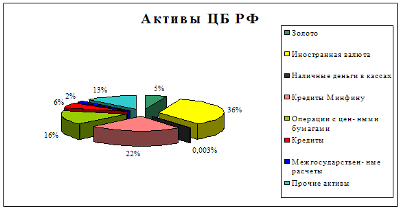 Основными активами ЦБР можно считать: иностранную валюту, кредиты министерству финансов, операции с ценными бумагами. Эти статьи в сумме составляют более 70% активов. Основные пассивы: резервный фонд, наличные деньги в обращении, средства коммерческих банков, а также средства бюджета и клиентов.