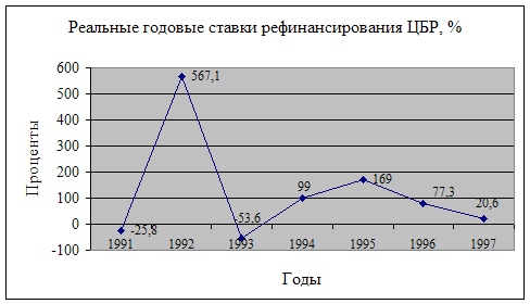 Инструменты и методы денежно-кредитной политики:- процент ставки по операциям Банка России; - нормативы обязательных резервов коммерческих банков (не менее 20%); - операции на открытом рынке; - рефинансирование банков; - валютное регулирование; - установка ориентиров роста денежной массы; - прямые количественные ограничения деятельности коммерческих банков. Операции на открытом рынке в России работают плохо по ряду причин. 1. Настороженное отношение инвесторов и участников рынка к государству. 2. Неразработанность рыночных процедур реализации и торговли государственными ценными бумагами. 3. Относительно невыгодные финансовые условия выпущенных облигаций. 4. Общий экономический кризис, делающий невыгодным выпуск долговых обязательств вообще. Рост резервной нормы увеличивает количество обязательных резервов, которые должны держать банки. Банки теряют свои избыточные резервы, снижается способность создавать деньги путем кредитования. А если банки будут вынуждены уменьшить свои чековые счета, то уменьшится и предложение денег. Уменьшение резервной нормы действует на денежное предложение обратным образом. Оно переводит часть обязательных резервов в избыточные и, тем самым, увеличивает способность банков создавать деньги путем кредитования. Центральный банк также осуществляет кредитование коммерческих банков. Для этого назначается так называемая учетная ставка (ставка рефинансирования). Особенно высокой (210%) учетная ставка была в период с 15 октября 1993 г. по 28 апреля 1994 г. Затем она снизилась до 120% годовых, начиная с 10 февраля 1996 г., а затем, в конце июля 1996 г. – до 110%, с 19 августа 1996 г. ставка рефинансирования - 80%. Затем она продолжила снижаться.[15] Динамика реальных годовых ставок рефинансирования представлена на графике.[16]