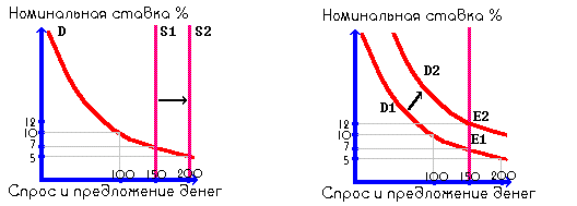 Рис 1 Рис 2 На рисунке 1 кривая S имеет форму вертикальной прямой линии при допущении, что центральный банк , контролирующий денежное предложение, стремится поддерживать его на фиксированном уровне независимо от изменений номинальной процентной ставки. Как и на любом рынке, равновесие на денежном рынке имеет место в точке пересечения кривых спроса и предложения. Из графика видно, что население и фирмы будут держать на руках около 150, допустим, миллиардов рублей, при процентной ставке равной 7%. При более низкой норме процента они будут стараться увеличить количество денег в своих портфелях, тем самым, толкая вниз цены на ценные бумаги, а норму процента вверх, достигая тем самым равновесия, и наоборот. Теперь предположим, что предложение денег увеличилось до 200 миллиардов рублей. Результатом будет падение ставки процента до 5%. При ставке процента, равной 7%, людям потребуется лишь 150 миллиардов. Излишек предложения в 50 миллиардов они инвестируют в ценные бумаги и другие финансовые инструменты. В итоге курсы ценных бумаг будут расти, что эквивалентно падению процентной ставки. Например, по долгосрочной облигации выплачивается процент в 300 рублей в год. Если цена облигации равна 3000 рублей, то норма процента равна 10%. Если цена облигации увеличится до 4000 рублей , то норма процента составит 7,5%. По мере падения процентной ставки цена хранения денег также уменьшается, и население и фирмы увеличивают количество наличности и чековых депозитов. При ставке процента, равной 5%, равновесие на денежном рынке будет восстановлено: спрос и предложение денег будет равно 200 миллиардов рублей. При сокращении предложения денег возникает временный их дефицит. Население пытается преодолеть нехватку денег путем продажи акций и облигаций. Рост предложения на рынке ценных бумаг понизит их рыночную стоимость и одновременно увеличит процентную ставку. Более высокая процентная ставка повышает цену хранения денег и уменьшает их количество, которое люди хотят иметь на руках. Спрос на деньги сокращается и денежный рынок возвращается к равновесию. Теперь проанализируем ситуацию на втором рисунке. Первоначально рынок находится в равновесии в точке Е1 при номинальной ставке процента в 7%. Рост номинального дохода сдвигает кривую спроса на деньги в положение D2. Положим, что процентная ставка в данное время равна 5%, и соответственной люди хотят держать на руках 200 миллиардов , но банковская система может предложить лишь 150 миллиардов и центральный банк не намерен увеличивать предложение денег. Население и фирмы предпринимают попытки приобрести больше денег, продавая ценные бумаги. Эти действия приводят к понижению цены ценных бумаг и, соответственно, к повышению номинальной ставки процента до 12%, что обеспечивает соответствование количества денег, находящихся в обращении, количеству денег, хранящихся у населения и фирм в соответствии с их желаниями. Денежный рынок достигает нового положения равновесия. Уменьшение спроса на деньги запускает рассмотренные процессы в обратную сторону. Подведем некий итог: