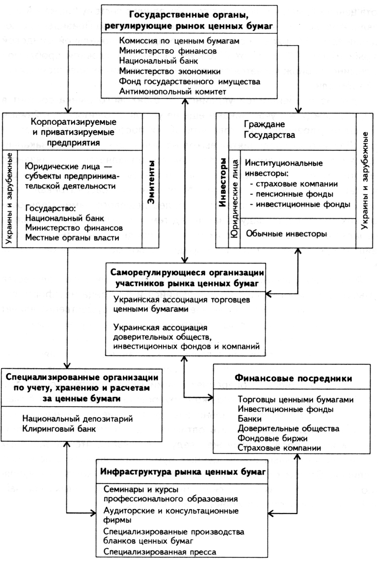 Рис. 1.1 Структура рынка ценных бумаг Эта укрупненная структура рынка ценных бумаг в значительной степени приближается к структурам, сложившимся за многие десятилетия в странах с развитой рыночной экономикой. Из этого рисунка видно, что главные действующие лица на рынке ценных бумаг — эмитенты, инвесторы и финансовые посредники. Финансовые инструменты, обращающиеся на рынке, также похожи. Уже несколько лет функционирует Украинская фондовая биржа — специализированное учреждение, создающее условия для постоянно действующей централизованной торговли, обороты которой по операциям с ценными бумагами весьма внушительны. За годы своей деятельности эта биржа создала развитую инфраструктуру. В областных центрах открыты и функционируют 11 ее филиалов. С помощью французских специалистов создана электронная система оборота ценных бумаг, что позволит создать единую систему биржевой торговли. Именно в этой связи подготовлен проект указа Президента о создании единой биржевой системы под эгидой Национальной фондовой биржи, поскольку главной проблемой большинства бирж является отсутствие у них развитых электронных сетей торговли.[11] Одна из особенностей украинского фондового рынка состоит в том, что между его участниками еще не успели сложиться устойчивые отношения, позволяющие говорить об их постоянном воспроизводстве. Для многих предприятий выход на рынок ценных бумаг заканчивается с первой же эмиссией. Фондовый рынок Украины, состоящий из большого количества субъектов, во многом еще не устоявшийся и до конца не сформировавшийся (рисунок 1.2)[11], имеет один элемент, который существенно влияет на неустойчивый характер взаимоотношений между субъектами рынка ценных бумаг и связан с ролью финансовых посредников. Если, например, американская или английская компания осуществляет эмиссию своих ценных бумаг, то почти всегда в этом участвуют фирмы, специализирующиеся на операциях с ними. Без их деятельности практически невозможно грамотно сконструировать выпуск ценных бумаг, так как только они, досконально зная положение на рынке ценных бумаг, в состоянии определить оптимальную стратегию привлечения средств инвесторов. Следует учитывать, что на западных рынках значительный объем ценных бумаг размещается с помощью подписки. В этом случае прибыль инвестиционной компании напрямую зависит от ее возможностей найти инвесторов, способных в кратчайший срок приобрести выпущенные ценные бумаги. В Украине же торговцы ценными бумагами не играли сколько-нибудь заметной роли в ходе первичной их эмиссии, хотя в нашей стране на 01.01.98 их зарегистрировано 813 (для сравнения в Японии таковых 120), в том числе 21 коммерческий банк. На 01.01.98 на фондовом рынке Украины осуществляли свою деятельность около 1000 профессиональных участников, в частности регистраторы ценных бумаг, организаторы торговли, хранители ценных бумаг и депозитарии. Общий объем торгов на организованно оформленных рынках в 1997 г. составил 762 млн. грн., что в 15,8 раза больше, чем в 1996 г.