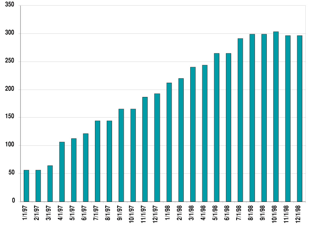 Рис. 1.4 Количество членов Ассоциации ПФТС, 1997—98 Практика применения подобных регулирующих механизмов в многих развитых странах и в большинстве стран, которые развиваются, убеждает в их эффективности и положительном влиянии на развитие фондового рынка. Обеспечение функционирования фондовой торговой системы и выполнение функций СРО есть важнейшими задачами Ассоциации ПФТС. Основными задачами Ассоциации являются: