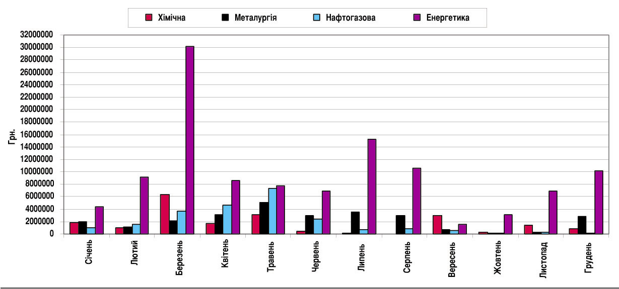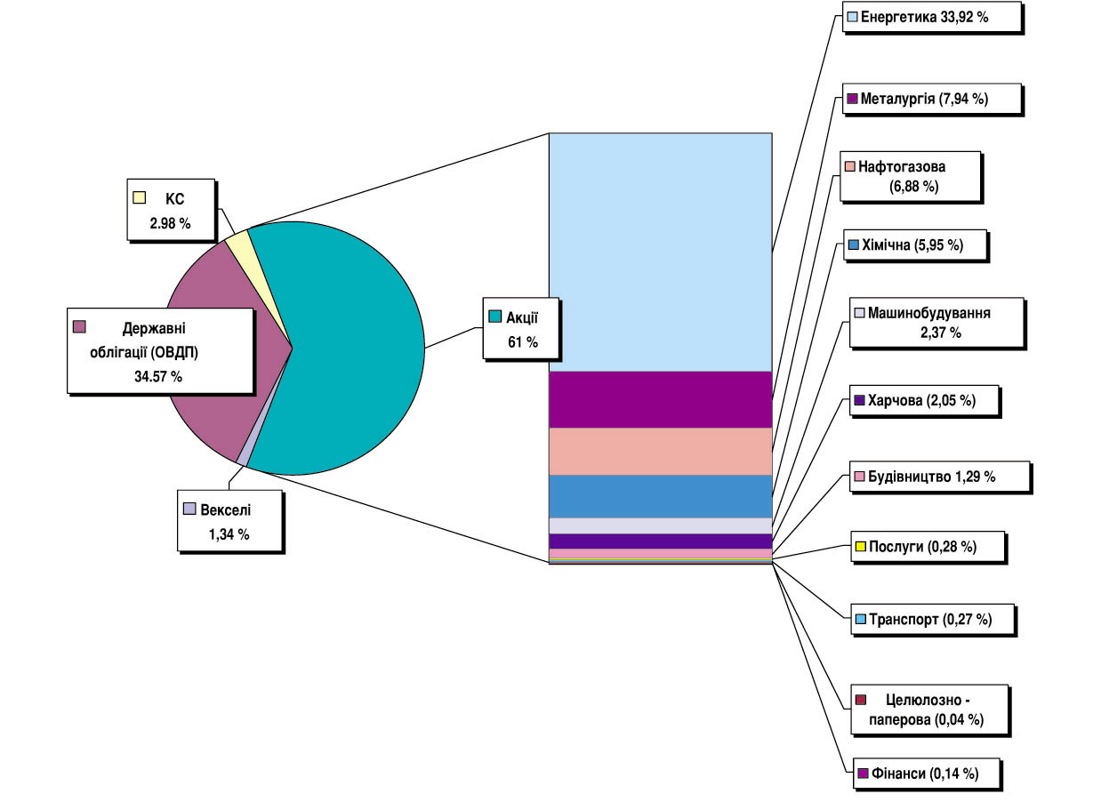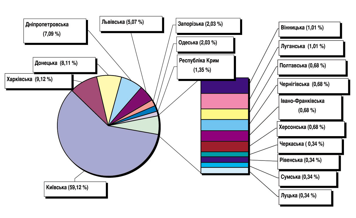 2.3.1 Отраслевая структура торгов в ПФТС В первом полугодии 1999 года в объеме торговли, равно как и в 1998 году, преобладали энергетические предприятия, которые занимают больше 60% торговли акциями. Надлежит отметить увеличения количества предприятий металлургии и химической промышленности, которое торговали в Системе. В таблицы 2.3.2 представлено распределение объем торговли за областями промышленности. Таблица 2.3.2 Распределение объема торговли в ПФТС за областями промышленности, 1999 год
