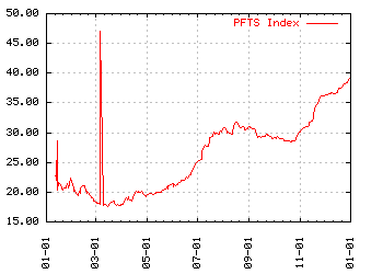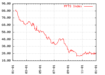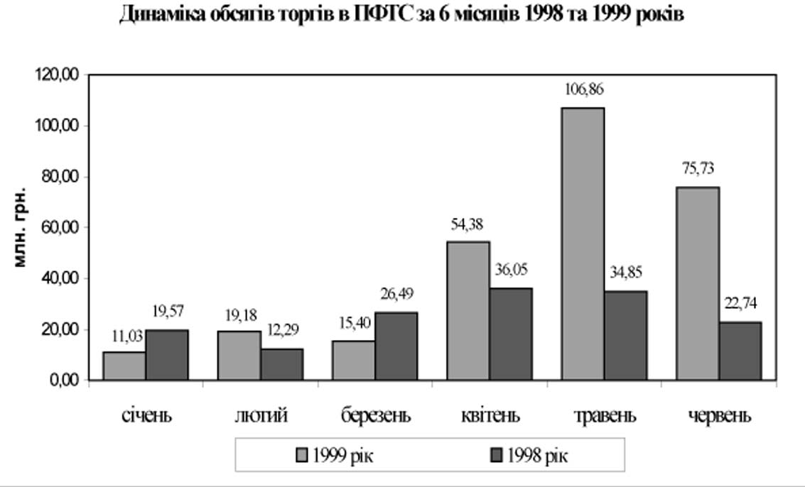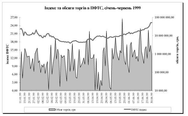 Рис. 2.2.5 Объем торговли акциями предприятий четырех областей Как видно из рис. 4.5 и таблицы 4.3, наибольшие объемы торговли акциями энергетических, нефтегазовых, металлургических и химических предприятий и уровень диверсификации торговли наблюдались с марта по май. Наибольший объем торговли акциями предприятий энергетической области наблюдался в марте (30,2 млн. грн.), нефтегазовой — в мае (7,3 млн.), металлургии — в мае (5,1 млн. грн,), химической — в марте (6,3 млн. грн.). 2.3 Обзор работы фондового рынка (ПФТС) Общий объем торгов Фондовой торговой системе ПФТС за 6 месяцев в этом году составил 282 576 933.50 грн., что равно 83% от объема ПФТС за весь 1998 год. За первое полугодие было осуществлено 1254 соглашения, общее количество ценных бумаг, проданное в первом полугодии 1999 года, составила 1,2 млрд. Среднесуточный объем равно 2,4 млн. грн, в то время, как в 1998 году этот показатель не превышал 500 тыс. грн. Максимальный дневной объем торгов за 6 месяцев 1999 г. было зафиксировано в июне на уровне 83 млн. грн. Индекс с начала года увеличился на 17,8% и на 06.07.99 г. равнялся 26,65%. Можно говорить об определенной тенденции возрастания объема и количества соглашений уже начиная с апреля 1999 г. Общее количество ценных бумаг в торговой системе ПФТС на 01.07.99 г. - 430, с них больше чем ЗО акций прошли процедуру листинга на ПФТС по договору ПФТС с эмитентами акций. Количество ценных бумаг, которое постоянно торгуются в ПФТС, возросла с 20 в начале года до 39 в июне. Общая капитализация всех предприятий Списка ПФТС составляет больше чем 5,9 млрд. грн., что на 30% больше сравнительно с концом 1 квартала 1999 г. Такой рост был достигнут как благодаря увеличению количества акций, которое торгуются в ПФТС, так и благодаря увеличению капитализации наиболее больших предприятий за счет роста рыночных цен. Расширился диапазон векселей в торговой системе. На конец полугодия их количество составила 42, в начале же 1999 г. их было лишь 11. Кроме того, в системе торгуются все виды государственных. облигаций, в том числе и конверсионные. Состоянием на 01.07.99 г. по акциям восьми эмитентов, таких как ГАЭК "Киевэнерго", ОАО "Укрнефть", ОАО "Нижнеднепровский трубопрокатный завод", ОАО Концерн "Стирол" и прочие, спрос превышал предложение, причем по некоторым - в 2-3 раза. Намного уменьшились спреды по ценным бумагам, которые более всего торгуются в системе ПФТС. Например, по акциям ГАЭК "Киевенерго" спред с начала года уменьшился с 50% до 26%, по акциям ОАО концерн «Стирол» – с 85% до54% и т.д. Это вызвано как ростом цен покупки, так и снижением цен продаж.