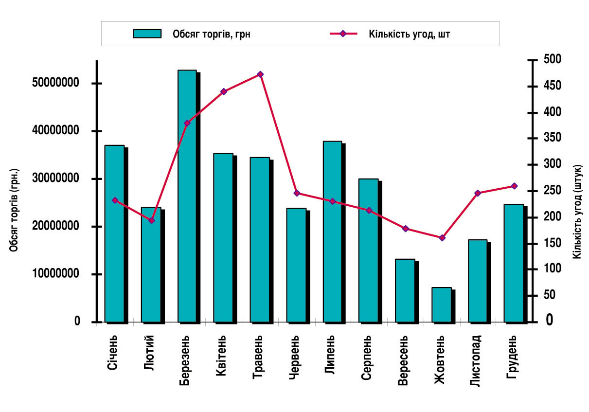 Данное распределение произошло из-за повышения интереса к акциям энергетической отрасли, что привело как в увеличению объема торгов, так и повышение в связи с этим доверие к акциям отрасли. 2.3.2 Лидеры среди акций Лидером как за объемом торговли, так и за количеством соглашений, являются акции ГАЭК "Киевэнерго". В таблицы 2.3.3 приведенные показатели лидеров за объемом торговли и количеством соглашений. Таблица 2.3.3 Показатели лидеров среди акций, которые торговали в ПФТС