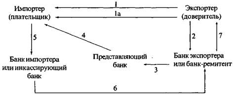 1. Экспортер заключает контракт с импортером о продаже товаров на условиях расчетов по документарному инкассо и отправляет ему товар (1а). 2. Экспортер направляет своему банку инкассовое поручение и коммерческие документы. 3. Банк экспортера пересылает инкассовое поручение и коммерческие документы представляющему банку (или банку импортера). 4. Представляющий банк предъявляет эти документы импортеру. 5. Импортер производит оплату документов инкассирующему (или своему) банку. 6. Инкассирующий банк переводит платеж банку-ремитенту (или банку экспортера). 7. Банк-ремитент зачисляет переведенную сумму на счет экспортера. Различают простое и документарное инкассо. Простое (чистое) инкассо означает взыскание платежа по финансовым документам, не сопровождаемым коммерческими документами; документарное (коммерческое) инкассо финансовых документов, сопровождаемых коммерческими документами, либо только коммерческих документов. При этом на банках не лежит каких-либо обязательств по оплате документов. Экспортер после отправки товара поручает своему банку получить от импортера определенную сумму валюты на условиях, указанных в инкассовом поручении, содержащем полные и точные инструкции. Имеются две основные разновидности инкассового поручения: а) документы выдаются плательщику против платежа (Д/П) и б) против акцепта (Д/А). Иногда практикуется выдача документов импортеру без оплаты против его письменного обязательства произвести платеж в установленный период времени. Используя такие условия, импортер имеет возможность продать купленный товар, получить выручку и затем оплатить инкассо экспортеру. В целях ускорения получения валютной выручки экспортером банк может учесть тратты или предоставить кредит под коммерческие документы. Таким образом, инкассовая форма расчетов связана с кредитными отношениями. Инкассо является основной формой расчетов по контрактам на условиях коммерческого кредита. При этом экспортер выставляет тратту на инкассо для акцепта плательщиком, как правило, против вручения ему коммерческих документов (документарное инкассо), при наступлении срока платежа акцептованные векселя отсылаются для оплаты на инкассо (чистое инкассо). Расчеты в форме инкассо дают определенные преимущества импортеру, основное обязательство которого состоит в осуществлении платежа против товарных документов, дающих ему право на товар, при этом нет необходимости заранее отвлекать средства из своего оборота. Однако экспортер продолжает сохранять юридически право распоряжения товаром до оплаты импортером, если не практикуется пересылка непосредственно покупателю одного из оригиналов коносамента для ускорения получения товара. Вместе с тем инкассовая форма расчетов имеет существенные недостатки для экспортера. Во-первых, экспортер несет риск, связанный с возможным отказом импортера от платежа, что может быть связано с ухудшением конъюнктуры рынка или финансового положения плательщика. Поэтому условием инкассовой формы расчетов является доверие экспортера к платежеспособности импортера и его добросовестности. Во-вторых, существует значительный разрыв во времени между поступлением валютной выручки по инкассо и отгрузкой товара, особенно при длительной транспортировке груза. Для устранения этих недостатков инкасс