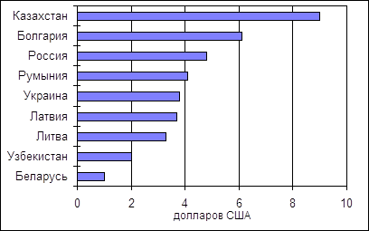 Рис. 6. Прямые иностранные инвестиции на душу населения 1993 -1997 год Мнение иностранных инвесторов относительно качества инвестиционного климата в Беларуси по сравнению с другими странами бывшего Советского Союза и странами Восточной Европы вполне очевидно из рисунка 6. Эта картина является очень драматичной, если уровень инвестиций на душу населения в Беларуси сравнивать с такими странами, как Словения и Польша. Если в Беларуси инвестиции составляют лишь 1 доллар США на человека, то Словения и Польша привлекают около 50 долларов США, а Чешская Республика и Эстония – около 100 долларов США на человека в год. Эти страны едва ли имеют природно–экономические преимущества перед Беларусью с ее непревзойденным географическим положением, тесными связями и хорошим доступом как к восточным, так и западным рынкам, квалифицированной рабочей силой и отличной базовой производственной инфраструктурой. Нет сомнений в том, что Беларусь обладает огромным потенциалом для расширения притока прямых иностранных инвестиций только за счет улучшения инвестиционного климата. Меры, которые можно относительно легко предпринять для достижения этой цели, сосредоточены в трех основных областях: а) формирование цен под воздействием конкурентных рыночных сил, б) разработка прозрачной и справедливой правовой базы, соответствующей международным стандартам, в) создание благоприятной среды. Рекомендованные здесь действия в равной мере важны для привлечения как внутренних, так и иностранных инвестиций. Отношение и ко внутренним, и к иностранным инвесторам должно быть одинаковым. Опыт других стран свидетельствует о том, что доля внутренних инвесторов в общем годовом объеме инвестиций составляет примерно 80– 90%. Поэтому они имеют чрезвычайное значение для общей стратегии экономического роста. Цены, формируемые рынком. Одним из слагаемых успеха в осуществлении перехода от системы административного регулирования к рыночной экономике является размещение ресурсов на основе формирования цен под действием рыночной конкуренции. Без конкурентного формирования цен рыночная экономика потерпит крах. В рыночной экономике цены являются по существу единственным ориентиром для эффективного размещения ресурсов. Инфляция, административное регулирование цен или ограничение рентабельности, субсидии, монополистические рыночные структуры, препятствия созданию и закрытию предприятий, установление цен государственными предприятиями, необоснованные налоговые ставки и барьеры внешней торговле – все это искажает цены, уменьшая тем самым перспективы для эффективного использования ресурсов и быстрого улучшения жизненного уровня. Если инвестор не может руководствоваться решением правительства о том, что цены формируются рынком, если существует серьезный риск, что правительство вмешается в формирование цен, то велик и риск того, что доходы обернутся потерями, а инвестор обратит свой взор на другие рынки. В условиях системы административного регулирования, унаследованной Беларусью от советской эпохи, цены были скорее элементом бухгалтерского учета, чем механизмом принятия решений в производстве и потреблении. Цены устанавливались посредством волевых решений, а не конкурентных сил спроса и предложения. Когда предприятие получало "сверхприбыль" при преобл