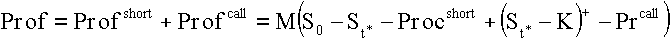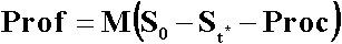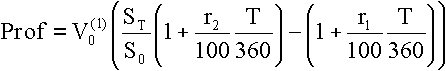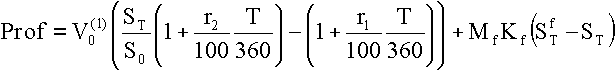 Здесь St - курс второй валюты относительно первой Vt(1)=St Vt(2) в момент времени t, Vt(1) - текущая стоимость первой валюты, ri, i=1,2 - ставка процента для i-ой валюты. Суммарный выигрыш получается при ST>S0 и r2>r1. Валютный риск связан со случайными значениями курса ST. Прибыли/убытки, полученные арбитражером по окончании финансовой операции, вычисляются по формуле
