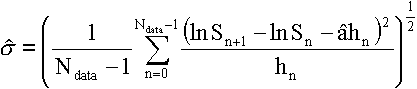 Оценка неизвестных параметров математической модели ценыИсторической волатильностью называется оценка волатильности по результатам наблюдений за ценой финансового инструмента на некотором прошедшем периоде времени. А подразумеваемая волатильность - это волатильность цены базисного актива, соответствующая рыночной стоимости опциона за вычетом внутренней стоимости в рамках используемой теоретической модели расчета стоимости опциона. Подразумеваемая волатильность не связана с текущей ценой базисного актива. Сравнивая историческую и подразумеваемую волатильность, биржевые торговцы делают вывод о завышенной или заниженной рыночной стоимости опциона, что позволяет сравнивать различные опционы между собой. Задание прогнозируемой волатильности, используемой при расчете справедливой стоимости опциона, считается высшим искусством в ценообразовании опционов, хотя это всего лишь один из элементов процедуры задания гипотетической рыночной ситуации. Основой для задания прогнозируемой волатильности все же служит оценка исторической волатильности цены базисного актива. Для СДУ (1) оценка максимального правдоподобия исторической волатильности по данным дискретных наблюдений за стоимостью или значением базисного актива хорошо известна: