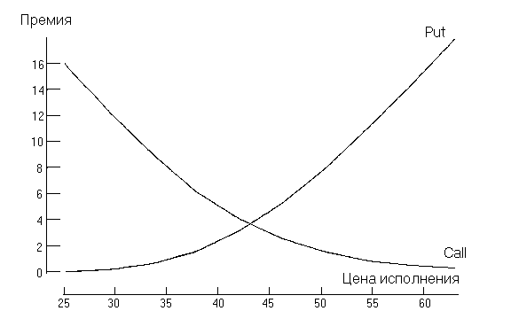 Рис.2. Зависимость премии опционов купли и продажи европейского стиля от цены исполнения