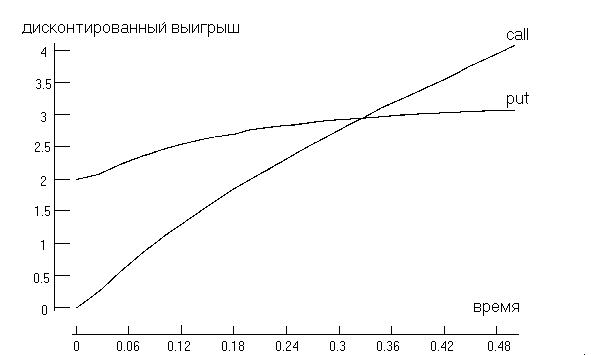Как видно из рисунка, максимальное значение дисконтированного среднего выигрыша для обоих опционов достигается в конце интервала [0,T]. Это означает, что при выбранных параметрах премии опционов купли и продажи европейского и американского стиля совпадают и равны Prcall = 4.06, Prput = 3.07. В реальной жизни в каждом опционном классе премию приходится рассчитывать