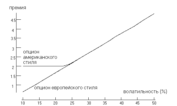 Рис.5. Зависимость премии опционов продажи американского и европейского стиля от волатильности
