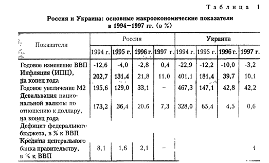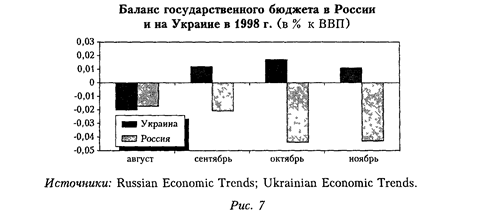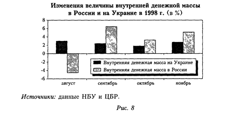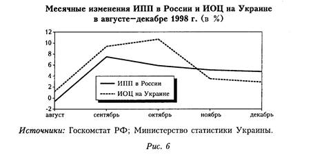 в России составил 50%, а на Украине - 13,5%. Это значит, что коэффициенты влияния девальвации на ИПЦ различались незначительно - 0,31 в России и 0,23 на Украине. Напротив, похожие отношения, рассчитанные для российского индекса промышленного производства (ИПП) и украинского индекса оптовых цен (ИОЦ), дают совершенно иные результаты. Коэффициент влияния для России равен 0,08, а для Украины - 0,42. В обеих странах изменение цен на продовольственные и промышленные товары оказало решающее влияние на динамику ИПЦ с тем отличием, что российская экономика пережила скачок цен в сентябре, а на Украине цены корректировались постепенно. Сильная зависимость потребления продовольствия в России от импорта привела к тому, что цены на продовольственные товары в ней повысились намного больше, чем на Украине (как в абсолютном, так и в относительном выражении). Что же касается показателей ИПП/ИОЦ, то очевидно, что изменения обоих индексов обусловлены различиями в структуре торговли и производства. В России - стране, обладающей значительными запасами природных ресурсов, несоразмерного увеличения ИПП не произошло. Украина, напротив, не имеет достаточных запасов природных ресурсов, импортирует нефть, природный газ и т.д., поэтому здесь рост ИОЦ был существенным. На установление реального уровня инфляции повлияли и такие психологические факторы, как инфляционные и девальвацион-ные ожидания и политическая нестабильность. Во-первых, меры, предпринимавшиеся для преодоления кризиса в России и на Украине, были разными. Россия решила объявить дефолт на рынке ГКО-ОФЗ и мораторий на выполнение коммерческими банками своих внешних обязательств. Вскоре после этого она ввела "плавающий" курс рубля. Украинские власти выбрали путь административного контроля обменного курса. Кроме того, они смогли реструктуризовать большую часть государственного долга". Как раз в начале кризиса (4 сентября 1998 г.) Совет директоров МВФ утвердил программу расширенного кредитования для Украины. Россия же, напротив, фактически потеряла доступ к выделенному в июле кредиту МВФ. Во-вторых, Россия пережила не только девальвационный, но и банковский кризис, которого на Украине пока удалось избежать. Хаотичные меры, предпринятые в России в августе-сентябре 1998 г. для преодоления кризиса, еще больше усилили панику и "бегство" от рубля. В-третьих, политический хаос в России в конце августа - начале сентября 1998г. дополнительно дестабилизировал ситуацию. Отставка ориентированного на рыночные реформы правительства С. Кириенко и назначение на ключевые руководящие посты в правительстве и ЦБР протеже коммунистов ясно сигнализировали о том, что новые власти вместо проведения непопулярных, но необходимых реформ " По крайней мере теоретически это было сделано па добровольной основе, без объявления дсфолта или моратория. предпочтут дополнительную денежную эмиссию. (Правда, эти опасения оправдались лишь частично.) Украина смогла поддержать относительную политическую стабильность и избежать кадровых перестановок (в особенности в руководстве НБУ), что могло бы еще больше усугубить кризисные ожидания населения. Все вышеупомянутые факторы значительно повлияли на внутренний спрос на деньги через изъятие депозитов, замещение национальных валют долларом США, а также способствовали временному увеличению сп