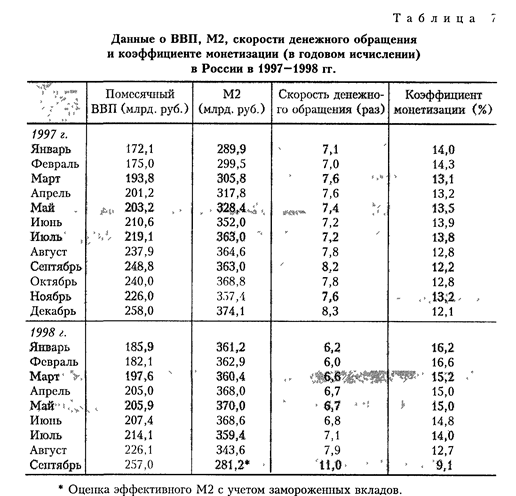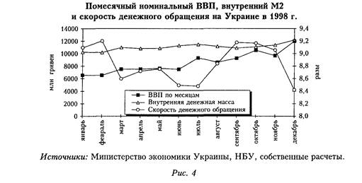Из данных таблицы 5 можно сделать следующие выводы: - во-первых, в ответ на девальвационный кризис произошло перемещение спроса с национальной валюты на иностранную (об этом свидетельствует сокращение внутренней денежной массы сразу после кризиса - в августе и начале сентября 1998 г.); - во-вторых, вследствие банковского кризиса спрос на деньги переместился от спроса на депозиты к спросу на наличность (как рублевые, так и долларовые депозиты значительно уменьшились); - в-третьих, из-за эмиссии в целях преодоления фискального кризиса ускорился рост денежной массы в результате сокращения обязательных резервов и увеличения наличных денег в обращении (не считая денег, созданных банками). При отсутствии точных данных о вкладах, замороженных в банковской системе, общее влияние финансового кризиса на величину денежной массы может быть оценено только приблизительно. В таблице 6 предпринята попытка учесть все вышеупомянутые факторы. Номинальный и реальный ВВП и скорость денежного обраще ния. Финансовый кризис был тесно связан с ускорением спада производства и еще большим ускорением инфляции. В сентябре 1998 г. реальный ВВП был на 4,6% ниже, чем в июле, хотя в результате роста цен он номинально увеличился на 20%. Подобный рост номинального ВВП и фактическое 20-процентное сокращение эффективной денежной массы привели к 40-процентному росту скорости денежного обращения. В таблице 7 приведены помесячные данные о ВВП, М2, скорости денежного обращения и коэффициенте моне-тизации начиная с января 1997 г., чтобы представить кризисную динамику в более широком контексте. Кризис привел к значительному снижению спроса на национальную валюту. В то же время после спада инфляционной "волны", прокатившейся в начале сентября, уровень цен стал выше, и для проведения того же количества сделок был необходим больший объем рублевой наличности. Ограничения на доступ населения к банковским вкладам фактически привели к сокращению денежной массы. В условиях, когда доверие к банковской системе уже и так было подорвано, это помогло уравновесить денежный рынок в краткосрочной перспективе. В октябре 1998 г. наблюдалась относительная стабилизация инфляции и обменного курса. Таким образом, можно предложить предварительную гипотезу о том, что скорость денежного обращения (рас- Скорость денежного обращения рассчитывается как месячный ВВП в годовом исчислении, разделенный на М2; коэффициент монетизации - величина, обратная скорости денежного обращения. Источники: поминальный ВВП - Russian Economic Trends; М2 - ЦБР; скорость денежного обращения и коэффициент монетизации - собственные расчеты. считанная на основе приведенных выше допущений) в это время была довольно близка к равновесной. Следовательно, любое увеличение денежной массы (это также относится и к облегчению доступа населения к замороженным банковским счетам) обусловило бы poci цен и дальнейшую девальвацию рубля, а скорость денежного обращения оставалась бы на прежнем уровне. Денежные агрегаты на Украине В начальный период кризиса, то есть в первой половине августа