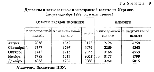 сокраще ния предоставляемых банками межбанковских кредитов и общей неопределенности в банковском секторе. В сентябре денежная база увеличилась на 2,2%, а МО снизился на 1,2%. Резервы банков возросли с приблизительно 600 млн. гривен до кризиса до более чем 1 млрд. гривен в результате повышения нормы обязательного резервирования (на 1,5%) и исключения из обязательных резервов наличности и части государственных ценных бумаг. Изменения денежной базы произошли под влиянием продолжавшегося оттока капитала с рынка государственных облигаций и кредитования правительства в начале кризиса, которое хотя и сократилось, но оставалось значительным. Следовательно, продолжалась докризис-ная практика стерилизации оттока капитала внутренним кредитом НБУ. Чтобы избежать дефолта, правительство договорилось с внутренними и внешними инвесторами о реструктуризации задолженности по государственным обязательствам. НБУ предоставил отдельным банкам, положение которых после реструктуризации государственных ценных бумаг сильно ухудшилось, дополнительные кредиты для их рефинансирования. Это привело к увеличению внутреннего кредита и одновременно уменьшило давление на валютные резервы со стороны нерезидентов, тем самым способствуя росту денежных агрегатов. Денежная база увеличилась в октябре и ноябре соответственно на 4,7 и 6,3%, а МО - на 3,2 и 0,9%. Внутренняя денежная масса в августе 1998 г. сократилась приблизительно на 3% (пропорционально уменьшению МО) - до уровня 11142 млн. гривен, то есть в структуре денежной массы компонент внутренних депозитов существенно не изменился и в конце месяца остался на уровне 4758 млн. гривен (см. табл. 9). В то же время широкие деньги (включая депозиты в иностранной валюте) уменьшились менее чем на 1%. Это было очевидным следствием переоценки валютных депозитов в связи с 5,6-процентной девальвацией гривны в августе. Дальнейшее сокращение внутренней денежной массы - на 2,4% в сентябре - произошло главным образом из-за уменьшения депозитов в национальной валюте на 200 млн. гривен. Удивительно, однако, что в сентябре гривневые вклады населения увеличились на 200 млн. и в последующие месяцы оставались на относительно постоянном уровне. В условиях кризиса население в основном изымало свои валютные вклады, которые, несмотря на 60-процентную девальвацию, сократились на 300 млн. гривен. Общая сумма депозитов в ноябре 1998 г. достигла августовского уровня, в результате чего в этом месяце внутренняя денежная масса увеличилась на 2,7%. Изменения в структуре широких денег продиктованы склонностью населения и предприятий к сбережениям в национальной и иностранной валюте. Депозиты в национальной валюте существенно не сократились, в то время как депозиты в иностранной валюте в гривневом выражении увеличились на 30%, а в реальном - уменьшились на 20%. Почти 60-процентная девальвация не привела к значительному снижению спроса на гривну. После появления симптомов некоторого экономического оздоровления в первой половине 1998 г. в период кризиса реальный ВВП начал сокращаться. Это уменьшило спрос экономических агентов на деньги для расчетов и депозитов, что вместе с ростом цен ограничило реальный спрос на деньги. К тому же портфельный спрос на гривну исчез задолго до начала кризиса в связи с падением спроса на государственные ценные бумаги.