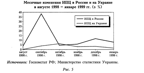 Украинская экономика характеризуется высоким уровнем дол-ларизации, доллары все еще остаются для населения средством сбережения, а иногда и расчетов. Поэтому кризис привел к масштабному изъятию вкладов в иностранной валюте, что не повлияло на спрос на национальную валюту. В результате скорость денежного обращения во время кризиса повысилась незначительно (см. рис. 4). Сравнение инфляционных последствии российского и украинского финансовых кризисов Масштабы корректировки цен в России и на Украине в исследуемый период сильно различались (см. рис. 5 и 6). Это определялось неодинаковой степенью девальвации валюты, разной структурой импорта и внутреннего производства, особенностями кризисного управления, включая денежную и фискальную политику. По отношению к I кварталу 1998 г. в ходе кризиса произошла почти 160-процентная девальвация рубля и с некоторым запозданием - 60-процентная девальвация гривны. В то же время рост ИПЦ
