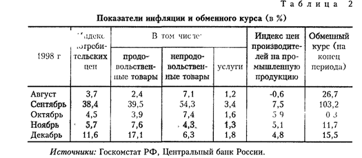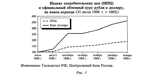 Чтобы понять прямую краткосрочную связь между девальвацией и ценами внутри страны, следует принять во внимание дополнительные факторы: прибыльность импорта и размеры запасов импортируемых товаров до девальвации. Нормы прибыли на импортируемые товары были, как правило, довольно высокими. По данным ЦБР, импортеры могли пережить по меньшей мере 40-процентную девальвацию рубля и при этом совсем не поднимать цены6. В преддверии кризиса пошлины на некоторые категории сельскохозяйственного импорта были снижены на 5-15%. Что же касается запасов импортируемых потребительских товаров, сделанных до 17 августа, то их должно было хватить до конца ноября. За товары, проданные в сентябре, очень редко платили по новому обменному кур- 6 Информационное агентство "Интерфакс", Финансовый отчет, 1998, т. VII, вып. 39 (355),2 октября. су. С начала кризиса платежная система пребывала в хаотичном состоянии и по этой причине объемы импорта существенно снизились (в сентябре - на 45,4% по сравнению с августом). После кратковременного периода неопределенности в конце августа-начале сентября 1998 г. не наблюдалось случаев нехватки товаров. Таким образом, у импортеров, по-видимому, был некоторый простор для сглаживания влияния девальвации на цены. Влияние инфляционных ожиданий и спекулятивного спроса на первоначальный скачок цен в России. У дверей банков появились очереди обозленных вкладчиков, рубль стремительно падал. В отсутствие правительства не было никакой определенности относительно будущей экономической политики. В этой ситуации ожидания усиления инфляции и дальнейшей девальвации рубля оказались высокими. Спекулятивный спрос как на товары, так и на доллары возрос, поскольку люди хотели застраховать себя от неизвестности и избавиться от обесценивающихся рублей. В конце августа-начале сентября в магазинах возник дефицит товаров. Это объяснялось как ростом ажиотажного спроса, так и тем, что продавцы придерживали товары, опасаясь продать их слишком дешево до того, как установится среднесрочная равновесная цепа. В первую педелю сентября инфляция и паника на рынке достигли своего пика. После этого на рынке потребительских товаров вновь было обеспечено равновесие, хотя выбор сократился: многие импортные товары надолго исчезли с прилавков. По данным Института конъюнктуры аграрного рынка, население сделало 2-4 месячные запасы продуктов длительного хранения7. В группе продовольственных товаров наибольший скачок цен наблюдался на продукты длительного хранения - как полностью импортируемые (чай, кофе), так и произведенные внутри страны (например, крупы и бобовые). Цены на непродовольственные товары, хранящиеся неограниченное время, росли еще быстрее, чем цены на продовольствие. Услуги вообще не поддаются хранению, поэтому незначительный рост цен на них отражает только инфляцию издержек, которая, вероятно, в полной мере проявится позднее. Резкий рост цен прекратился в середине сентября, чему способствовал ряд факторов. Во-первых, спала "волна" спекулятивного спроса на товары, поскольку люди использовали имеющиеся свободные денежные ресурсы и уже заполнили все свои кладовки. В то же время органы власти многих регионов начали вводить ценовые "потолки", что могло улучшить официальные показатели инфляции. Самое важное, по-видимому, то, что по мере роста цен номин