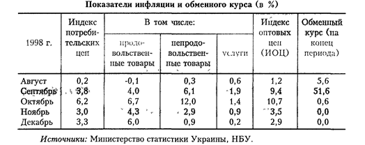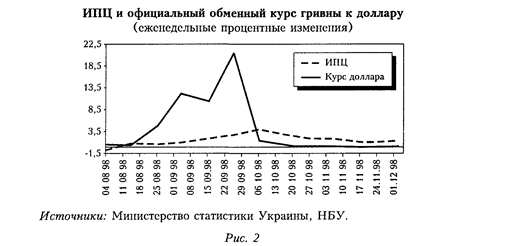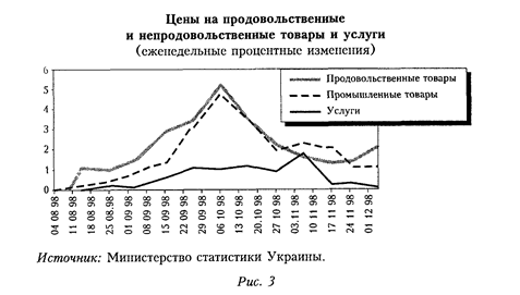 Обменный курс гривны снизился на 5,6% в августе 1998 г. и на 51,6% - в сентябре, оставаясь практически неизменным в последующие месяцы (см. табл. 3 и рис. 2). С сентября по ноябрь 1998 г. ИПЦ возрос приблизительно на 13,5%. Цены на продовольственные и непродовольственные товары увеличились соответственно на 15,7 и 22,3%. Темп их роста был выше всего в октябре. Цены на услуги в сентябре-октябре возросли на 4,3%, причем основной их рост пришелся на сентябрь - 1,9%.