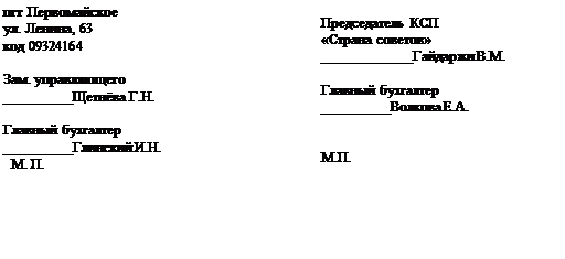 М.П. М.П. 15 июня 1998 года, настоящий Договор удостоверен мною, Смирновой Л.В., государственным нотариусом Первомайской государственной нотариальной конторы. Договор подписан сторонами в моём присутствии. Личности подписавших Договор установлены, дееспособны, а также правоспособность зам. управляющего первомайским отделением АК банка «Украина» и председателя КСП «Страна советов» и полномочия их представителей проверены. Зарегистрировано в реестре за №981 взыскано ггоспошлины: 66 гривен 25 копеек по кв. От 15.06.98г. Государственный нотариус____________________________________ Приложение Управляющему Первомайским отделением АК банка «Украина» Нестеренко Р.Л. КСП «Страна советов» Ходатайство Коллективное сельскохозяйственное предприятие «Страна советов», в лице его председателя Гайдаржи Владимира Михайловича, действующего на основании Устава КСП, просит Вас предоставить нам краткосрочный кредит в размере 25000 гривен (двадцать пять тысяч) сроком на 6 месяцев Краткосрочный кредит позволяет приобрести ГСМ, запчасти, семена капусты. Приобретение КСП запчастей позволит своевременно отремонтировать 10 комбайнов и подготовить технику к уборке урожая, приобретение семян позволит засеять 2 га поздней капусты, высокие урожаи которой и большой спрос гарантируют достаточный доход для погашения суммы кредита. Со своей стороны обязуемся предоставить все необходимые документы для получения кредита, вовремя производить расчёты по погашению задолженности, выполнять все правила кредитования. Председатель КСП «Страна советов» ______________________Гайдаржи В.М. (подпись) М.П. Главный бухгалтер_______________________Волкова Е.А. (подпись) |