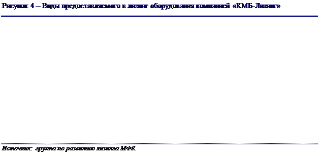 Московская лизинговая компания ЗАО «Московская лизинговая компания» учреждено в 1993 года. Учредителями являются Московский фонд поддержки малого предпринимательства и Российская ассоциация развития малого и среднего предпринимательства. Эта компания частично финансируется Московской администрацией, однако действует в основном на коммерческой основе. МЛК является примером оптимального хода развития такой компании, когда средства, предоставленные администрацией, становятся лишь толчком для развития бизнеса и в дальнейшем служат для поддержания наиболее затратных (субсидируемых) направлений деятельности. Изначально, одной из основных задач, стоявшей перед Московской лизинговой компанией являлась поддержка малого предпринимательства г. Москвы. Однако, за время свое работы Московская лизинговая компания значительно расширила сферу своей деятельности и вышла далеко за ее: работа ведется не только с малыми предприятиями, но и со всеми другими организациями, и не только в Москве, но и во многих регионах России. В настоящий момент Московская лизинговая компания является универсальной лизинговой компанией и в части видов имущества, передаваемых клиентам-лизингополучателям. Деятельность Московской лизинговой компании охватывает лизинг следующих видов оборудования, представленных на рисунке 2.