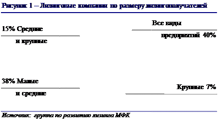 Лизинговые компании, предоставляющие услуги малому бизнесу Как уже упоминалось, поиск источников финансирования является одной из острейших проблем для малого бизнеса. Далеко не все банки согласны заниматься небольшими проектами и брать на себя дополнительные риски, присущие малому бизнесу. Однако практика показывает, что в этом секторе можно работать весьма успешно. По данным группы по развитию лизинга Международной Финансовой Корпорации (МФК) лизинговые компании работают в основном с малыми и средними предприятиями: