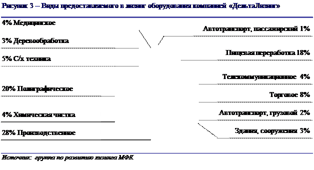 Через Московскую лизинговую компанию правительство г.Москва осуществляет проведение комплексной программы развития и поддержки малого предпринимательства. Дельта-Лизинг (DeltaLeasing) Учредитель ЗАО «ДельтаЛизинг» – Дельта Капитал (ранее Инвестиционный Фонд США - Россия) – это инвестиционный фонд, созданный на деньги частных инвесторов и средства Агентства США по Международному развитию. Группа российских лизинговых компаний, учрежденных иностранными банками, немногочисленна. Неоспоримым их преимуществом является доступ к долгосрочному финансированию с низкими процентными ставками. Таким образом, они получают значительное конкурентное преимущество на российском рынке, устанавливая стоимость лизинговых услуг на уровне значительно более низком, чем доступный российским лизинговым компаниям. Также ДельтаЛизинг по сравнению с другими лизинговыми компаниями, специализирующимися на работе с малым бизнесом, предлагает больший максимальный размер сделки. Хотя, с другой стороны, финансовое участие в проекте данной компании ограничивается 75% стоимости оборудования, передаваемого в лизинг. Исследуя структуру портфеля ДельтаЛизинг (рисунок 3), можно отметить, что она более диверсифицирована по сравнению такими же лизинговыми компаниями, сотрудничающим с малым предпринимательством.