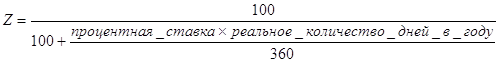 (1) 198 800 долл. х (1 + 0,165) (2) 198 800 долл. х (1 + 0,165)2 - сложные проценты за 2 года. Разница между итоговыми суммами не столь важна. Принципиально лишь то, что различные способы расчета номинальной стоимости векселей обеспечивают разные графики погашения задолженности. Каждый из них может быть более подходящим по сравнению с двумя другими в зависимости от предполагаемых сроков погашения обязательств. 2.5. Расчет дисконтаДИСКОНТ в банковской практике - это учетный процент, взимаемый банками при учете (покупке) векселей. Представляет собой выраженную в относительных величинах разницу между суммой векселя и суммой, уплачиваемой банком при его покупке. Приступая к расчету дисконта, необходимо прежде всего определить его вид - "ПРЯМОЙ ДИСКОНТ" или "ДИСКОНТ НА ДОХОД". Разницу между ними можно пояснить на следующем условном примере. Сумма простого дисконта в размере 10%, начисленного на вексель номиналом в 1 000 000 долл., составит 100 000 долл. (дисконтированная сумма будет равна 900 000 долл.). Если вексель погашается через год, то годовой доход по нему будет равен 100/900, или 11,11%. Таким образом, ПРЯМОЙ 10-процентный дисконт может быть определен как "дисконт по ставке, соответствующей годовому доходу в 11,11%", или как “дисконт на доход в 11,11%, начисляемый ежегодно”. На практике “дисконт на доход” является определяющей величиной при заключении форфейтинговых сделок. Поскольку же зачастую котируется лишь прямой дисконт, форфейтеры используют соответствующие таблицы пересчета. Если ставка процента, начисляемого экспортером, равна ставке дисконта, то дисконтированная цена векселей будет равна цене покупки (в нашем примере 994 000 долл.). Однако такое равенство совершенно не обязательно. Существуют различные формулы расчета дисконта. Одна из них учитывает дисконтирующий фактор Z, определяемый следующим образом: