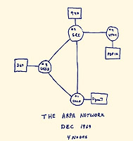Рисунок 2 – Документальный эскиз ARPANET Источник: http://www.computer-museum.ru/history_abroad/intern1. Признать 29 октября 1969 г. в качестве дня рождения Сети можно, но условно и только в том случае, если придерживаться узкого определения Интернета — это глобальная сеть, появившаяся в результате эволюции сети ARPANET и использующая коммуникационный протокол TCP/IP. Сегодня мы трактуем термин "Интернет" шире. В русском сегменте Сети удалось найти определение Интернета, взятое из книги "Справочник доктора Боба по доступу к Интернет через электронную почту" ("Doctor Bob’s Guide to Offline Internet Access"), 4-й выпуск — 1995 г., в переводе Вадима Федорова: "Internet (сущ.) — бурно разросшаяся совокупность компьютерных сетей, опутывающих земной шар, связывающих правительственные, военные, образовательные и коммерческие институты, а также отдельных граждан, с широким выбором компьютерных услуг, ресурсов, информации. Комплекс сетевых соглашений и общедоступных инструментов Сети разработан с целью создания одной большой сети, в которой компьютеры, соединенные воедино, взаимодействуют, имея множество различных программных и аппаратных платформ" [14]. Если начинать историю Интернета не с 1969 г., а раньше, то ее можно разделить на несколько этапов. 1945—1960. Теоретические работы по интерактивному взаимодействию человека с машиной, появление первых интерактивных устройств и вычислительных машин, на которых реализован режим разделения времени. 1961—1970. Разработка технических принципов коммутации пакетов, ввод в действие ARPANET. 1971—1980. Число узлов ARPANET возросло до нескольких десятков, проложены специальные кабельные линии, соединяющие некоторые узлы, начинает функционировать электронная почта, о результатах работ ученые докладывают на международных научных конференциях. 1981—1990. Принят протокол TCP/ IP, Министерство обороны США решает построить собственную сеть на основе ARPANET, происходит разделение на ARPANET и MILNet, вводится система "доменных" имен – Domain Name System (DNS), число хостов доходит до 100000. 1991—1999. Новейшая история. В последние годы под Интернетом понимается, как правило, сама Сеть и весь комплекс функционирующих в ней приложений, превращающих ее в новую экономическую и социальную среду коммуникации. Вопрос терминологии в данном случае отнюдь не праздный: более широкая трактовка с неизбежностью приводит к признанию того факта, что история Интернета началась намного раньше, а тридцать лет назад на базе доступных технических средств лишь оформилась определенная техническая политика, актуальная для своего времени. Ничто не вечно, через какое-то время техническая основа Интернета может принять совершенно другие формы, но глобальное информационное пространство теперь уже относится к числу таких безусловных данностей, как электричество, телефон и прочие достижения цивилизации. 1.2 Прогрессирующее развитие сети ARPANETНа самой ранней стадии развития Интернет велись исследования как по сетевой инфраструктуре, так и по сетевым приложениям. Данная традиция не нарушается и в наши дни. В последующие годы число компьютеров, подключенных к ARPANET, быстро росло. Одновременно велись работы по созданию функционально полного протокола межкомпьютерного взаимодействия и другого сетевого программного обеспечения. В декабре 1970 г. Сетевая рабочая группа (Network Working Group, NWG) под руководством С. Крокера завершила работу над п