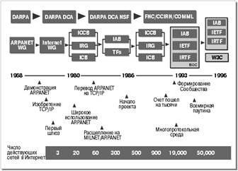 Рисунок 3 – Хронология Интернет Источник: http://www.jetinfo.ru/1997/14/1/article1.14.1997174.html 1.3 Коммерциализация технологииКоммерциализация Интернет включает в себя не только развитие конкурентных, частных сетевых сервисов, но и разработку коммерческих продуктов, реализующих Интернет-технологию. В начале 1980-х г.г. десятки производителей, предвидя спрос на подобные сетевые решения, встраивали TCP/IP в свои продукты. К сожалению, они не располагали достоверной информацией о том, как Интернет-технология должна была работать, и как потенциальные покупатели предполагали использовать сети. Большинство производителей видели в TCP/IP небольшую добавку к собственным закрытым сетевым решениям: SNA, DECNet, NetWare, NetBios. Министерство обороны США во многих контрактах требовало обязательного использования TCP/IP, но практически не помогало своим подрядчикам понять, как строить полезные TCP/IP-продукты. В 1985 г., осознав недостаток доступной информации и возможности пройти обучение, Дэн Линч (Dan Lynch) совместно с IAB организовал трехдневный семинар для ВСЕХ производителей. На семинаре рассказывалось о возможностях, устройстве и о нерешенных пока проблемах TCP/IP. Большинство докладчиков (всего их было около 50 на 250 слушателей) представляло исследовательские круги DARPA, разработавшие протоколы и использовавшие их в своей повседневной деятельности. Результаты семинара оказались удивительными для обеих сторон. Сотрудников компаний-производителей поразила открытость, с которой изобретали рассказывали о том, как все работает (и что пока не работает). Изобретатели с удовольствием узнали о новых для себя проблемах, с которыми сталкивались производители. Таким образом, начался диалог, продолжающийся более пятнадцати лет. После двух лет конференций, учебных курсов, встреч и семинаров проектировщиков, было организовано специальное мероприятие, на которое пригласили производителей наиболее зрелых TCP/IP-продуктов. Производители собрались на три дня в одном зале, чтобы продемонстрировать, насколько хорошо их продукты взаимодействуют между собой и с Интернет. В сентябре 1988 г. состоялась первая торговая выставка Interop. В ней приняли участие 50 компаний. Выставку посетило около 5 тысяч инженеров из организаций — потенциальных клиентов [18]. Их интересовало, действительно ли все работает так, как обещают. Все работало. Почему? Потому, что производители чрезвычайно настойчиво стремились обеспечить взаимодействие своих продуктов со всеми другими продуктами, даже представленными конкурентами. С тех пор размах торговых выставок Interop увеличился в огромной степени. В наши дни они каждый год устраиваются в семи местах, расположенных в разных странах. Их посещает более 250 тысяч человек, чтобы узнать о взаимной совместимости продуктов, о новинках на рынке и в технологии. Параллельно с действиями по коммерциализации, связанными с Interop, производители начали посещать собрания IETF, происходящие 3 или 4 раза в год, чтобы обсудить новые идеи по расширению семейства протоколов TCP/IP. Раньше на такие встречи, финансировавшиеся правительством, собиралось несколько сот человек, преимущественно из академических кругов. Теперь число участников нередко превосходит тысячу, по большей части они представляют производителей и сами оплачивают организационные расходы. Такое самоорганизующееся сообщество, объедин