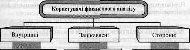 Рис. 1.3. Види фінансово-господарського аналізу Залежно від того, яка інформація використовується у фінансовому аналізі, якими є мета та об'єкти дослідження, суб'єкти користування результатами аналізу, розрізняють два його види: — зовнішній аналіз — базується на звітних даних, що підлягають опублікуванню; базою аналізу виступає досить обмежена частина інформації про діяльність підприємства, що є надбанням всього підприємства; — внутрішній аналіз — використовує всю достовірну інформацію про стан справ підприємства, якою володіє лише певне коло осіб, як правило, керівництво підприємства та його підрозділів. Якщо метою зовнішнього фінансового аналізу є оцінка та економічна діагностика фінансового стану підприємства за даними лише публічної звітності, поверховий аналіз прибутку і рентабельності, то в системі внутрішнього фінансового аналізу розв'язується ширше коло питань за рахунок наявності більш глибокої бази даних про діяльність підприємства. Задачі зовнішнього фінансового аналізу визначаються інтересами користувачів аналітичного матеріалу. До основних задач зовнішнього фінансового аналізу можна віднести: — оцінювання фінансових результатів діяльності підприємства; — аналіз ринкової та фінансової стійкості підприємства; — аналіз ліквідності та платоспроможності; — досліджування динаміки дебіторської та кредиторської заборгованості; — аналіз ефективності вкладеного капіталу; — оцінювання матеріального стану підприємства; — аналіз валюти бухгалтерського балансу. Внутрішній фінансовий аналіз глибше досліджує причини фінансового стану, що склався на підприємстві, ефективність використання основних та оборотних засобів, взаємозв'язок показників обсягу, собівартості і прибутку. Результати внутрішнього фінансового аналізу використовуються для планування, контролю та прогнозування фінансового стану підприємства. Мета внутрішнього фінансового аналізу полягає в забезпеченні планомірного надходження грошових коштів і розміщенні власного та позикового капіталу так, щоб створити умови для нормального функціонування підприємства, отримання максимального прибутку і виключення ризику банкрутства. Користувачів фінансового аналізу можна поділити на три групи (рис. 1.4).