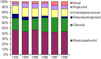 Государственные стандарты образования были определены для каждого из уровней и представлены в государственных учебных планах. Образование в Эстонской Республике приобретается путем посещения, определенных в Законе, учреждений народного образования, каковыми являются дошкольные заведения, обшеобразоватльные школы, профессиональные учебные заведения, высшие прикладные школы, университеты, школы по интересам, курсы пофышения квалификации, а также научно-методические учреждения. Закон также определяет, что все учебные учреждения могут базироваться на всех формах собственности, не протеворечащих Закону «О собственности», где базирующиеся на государственной и муниципальной собственности, за исключением университетов, называются «открытыми». В Эстонской Республике предусмотренна система всеобшего обязательного обучения, которое начинается с семилетнего возраста и продолжается до окончания основной школы. Государство и местное самоуправление обеспечивают возможность всеобшего обязательного обучения. Среднее образование в открытых учебных заведениях является бесплатным и материальное обеспечение отделено от педагогического руководства и контроля. Каждый из уровней власти обладает должным обьемом компетенции в принятии решений сваязанных с народным образованием. Верховный Совет Эстонской Республики определяет принципы формирования и развития системы народного образования. В компетенцию Правительства Эстонской Республики входит: принятие государственных программ развития образования и создания гарантий для их реализации; установление государственных льгот, в том числе льгот на получение крелита для учащихся, студентов и работников просвещения; установление основ оплаты труда работников открытых учреждений народного образования и государственных университетов. Органы местных самоуправлений, согласно Закону, обеспечивают хозяйственное обслуживание и финансирование, а также назначают на должность и освобождают от должности руководителей подведомственных им учреждений. Министерство просвещенияМинистерство просвещения является основным органом, заведущим вопросами образования в Эстонской Республике. Основной задачей министерства является разработка и реализация государственных программ развития народного хозяйства. В компетенцию министерства также входит составление и внедрение национального стандарта классификации народного образования, оссуществление координации, методического руководства, и консультации органов местного самоуправления по вопросам организации народного образования, участие в реализации политики Эстонской Республики в области науки, предоставление универститетам государственных заявок, а также разработка нормативов государственного финансирования народного образования. Кроме перечисленных основных положений министерство занмается широким рядом вопросов связанных с просвещением в Эстонской Республике. Финансирование учреждений народного образованияОткрытые учреждения народного образования и государственные университеты финансируются за счет государственных, муниципальных и собственных средств. В 1998 году деньги выделенные министерству просвещения из государственного бюджета составили 2 659 899, 1 тысяч крон. Это составило 17.8% от обшего государст