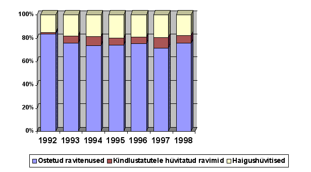 Бюджетный остаток на конец года 214 000 000 Центральная больничная касса опубликовала также краткое пояснение к бюджету на 1998 год. Как упоминалось ранее размер взноса обязательного медицинского страхования работодателей, действующих на административной территории уезда или республиканского города, равен 13%. Он исчисляется со всех денежных сумм и натуральной платы, выплаченных работодателем частным лицам, а также со всех введённых в пользу частных лиц отчислений. Эта так называемая часть уплаченного социального налога поступает в доход бюджета государственной больничной кассы. Министерство финансов запланировало получить доход с налогооблажения около 27,320 миллиардов крон. Медицинского страхования предполагалось должно было слставить 96,43% от этой суммы. Доходная часть бюджета государственного медицинского страхования варируется в течение всего года. Обычно денежная разница образовывается между расчётными счетами больничной кассы и медицинских учереждений, а также по причине предоплат, осуществляемых на основе договоров с аптеками. Прочие поступления составляют банковские проценты, начисляемые на депозитные суммы денег на расчётных счетах больничной кассы, а также от возврата ссуд, выданных в прошлые года медицинским учереждениям для приобретения дорогостоящей аппаратуры. Основная часть запланированных расходов, а точнее 74,2%, происходит из профилактики незастрахованных больных, а также из расходов, связанных с исследованиями в области здоровья и лечения. Выплаты возмещения по обязательному медицинскому страхованиюМедицинское страхование Эстонии руководствуется принципом солидарности: