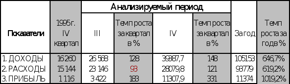 Из таблицы видно, что в 1996 году превышение доходов над расходами составило 11374 млн. рублей, в том числе, в IV квартале - 11307 млн. рублей. То есть совокупная прибыль, полученная за 1996 год на 99,4 % состоит из прибыли IV квартала. Темпы роста доходов опережали темпы роста расходов банка (646,7 и 619,2). При этом разрыв между ними составляет 27,5 % за год и 27 % в IV квартале. Это привело к увеличению прибыли банка - в 10 раз за 1996 год, в том числе в IV квартале - в 3,3 раза. Таблица 1