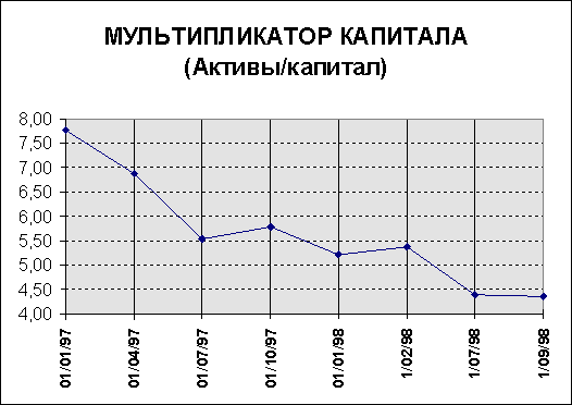Сразу же обращает на себя внимание повышенная температура банков Москвы ( по аналогии с температурой человеческого организма ~39,8 в 1997 году и ~41,2 в 1998 году). На недоуменные вопросы, неужели болезнь так запущена, можно уверенно ответить - да и началось это гораздо ранее рассматриваемого здесь периода. В чем причины? На фоне различных недомоганий разной степени тяжести, общая болезнь - больная экономика России. Банкам Москвы (да и всей России) просто не хватает ресурсов (т.е. привлеченных средств) для нормальной работы. И это отчетливо видно из динамики отношения Активы/Капитал (EM - equity multiplier, мультипликатор капитала, как принято называть этот показатель в западной экономической литературе). Рисунок 1.
