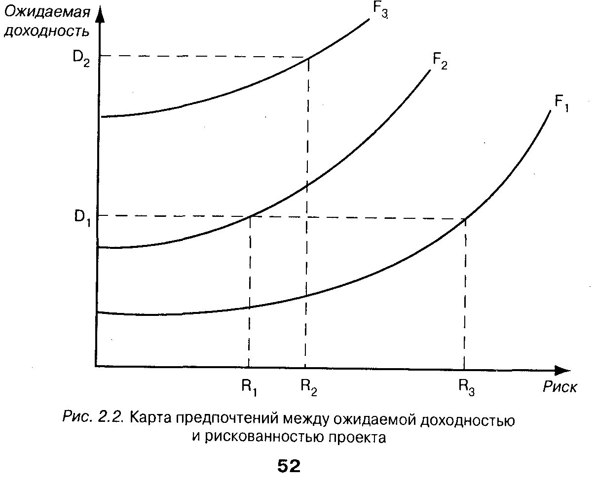 Карта предпочтений рисков1Кривые на карте предпочтений имеют положительный наклон. Изображенные на рисунке кривые носят название «кривых равных предпочтений» или «кривые безразличия», так как каждая из них отражает своими точками равнопредпочтимые для предпринимателя при данном уровне его удовлетворенности пары ожидаемой эффективности и рискованности решения. Приемлемых уровней удовлетворенности (полезности) может быть несколько. На приведенном рисунке их три, из них наиболее низкий из всех приемлемых уровень F1, наиболее высокий F3. Уровень F1 ниже, чем уровень F2 , так при одной и той же ожидаемой доходности решения в первом случае (для F1) величина риска R3 больше, чем риск R1 во втором случае (для F3). Сочетание же ожидаемой рентабельности решения и его рискованности, отвечающее одной из точек кривой равных предпочтений для уровня F3, оказывается тогда за счет более высокой ожидаемой доходности вложений в данное решение (хотя и при большем риске) более привлекательным для предпринимателя, соответствует более высокому уровню полезности для него. Карта предпочтений предпринимателя должна быть построена для него либо им самим, либо с помощью сторонних экспертов построена эмпирически, то есть на основе обработки данных анализа решений, которые принимались ранее. Однако для дальнейшего рассмотрения предпринимательского риска прежде всего необходимо определить исходное, базисное понятие “риск”. А. Альгин определяет риск как деятельность или действие по «снятию неопределенности»1. Б. Райзберг определяет риск как «ущерб, возможные потери», придерживаясь тем самым классической теории предпринимательского риска2. Анализ многочисленных определений риска позволяет выявить основные моменты, которые являются характерными для рисковой ситуации, такие, как: